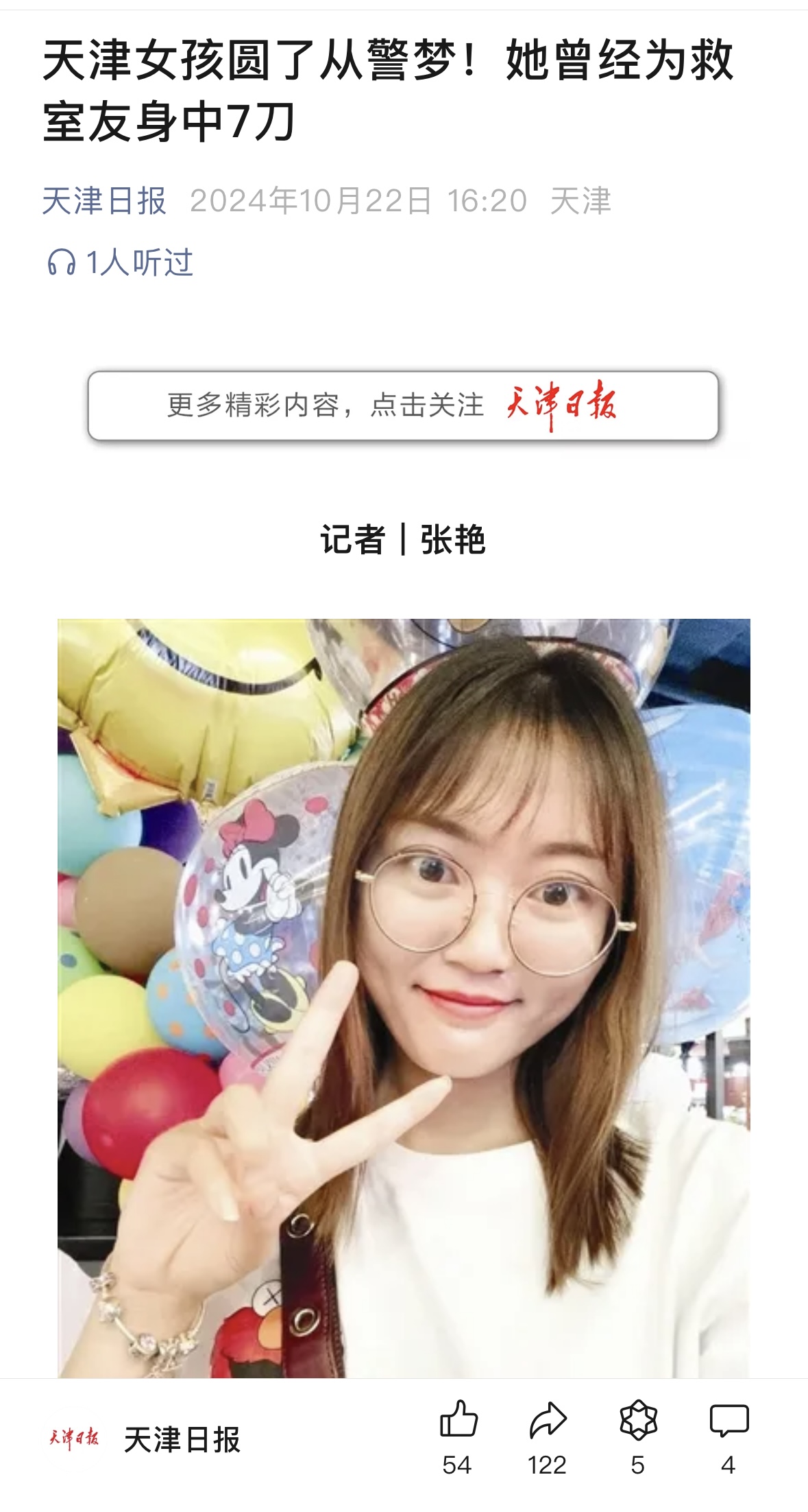 近日,全國見義勇為模范、天津市見義勇為先進個人劉威,如愿以償加入公安輔警隊伍,成為一名市公安機動勤務中心工作人員,穿上了她心愛的警服。
