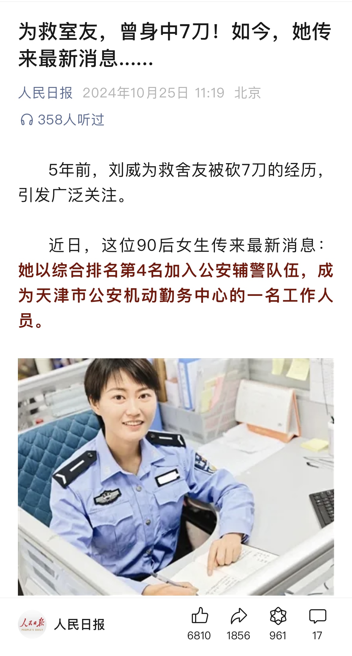 媒體關注 | 【人民日報】為救室友,曾身中7刀!如今,她傳來最新消息......