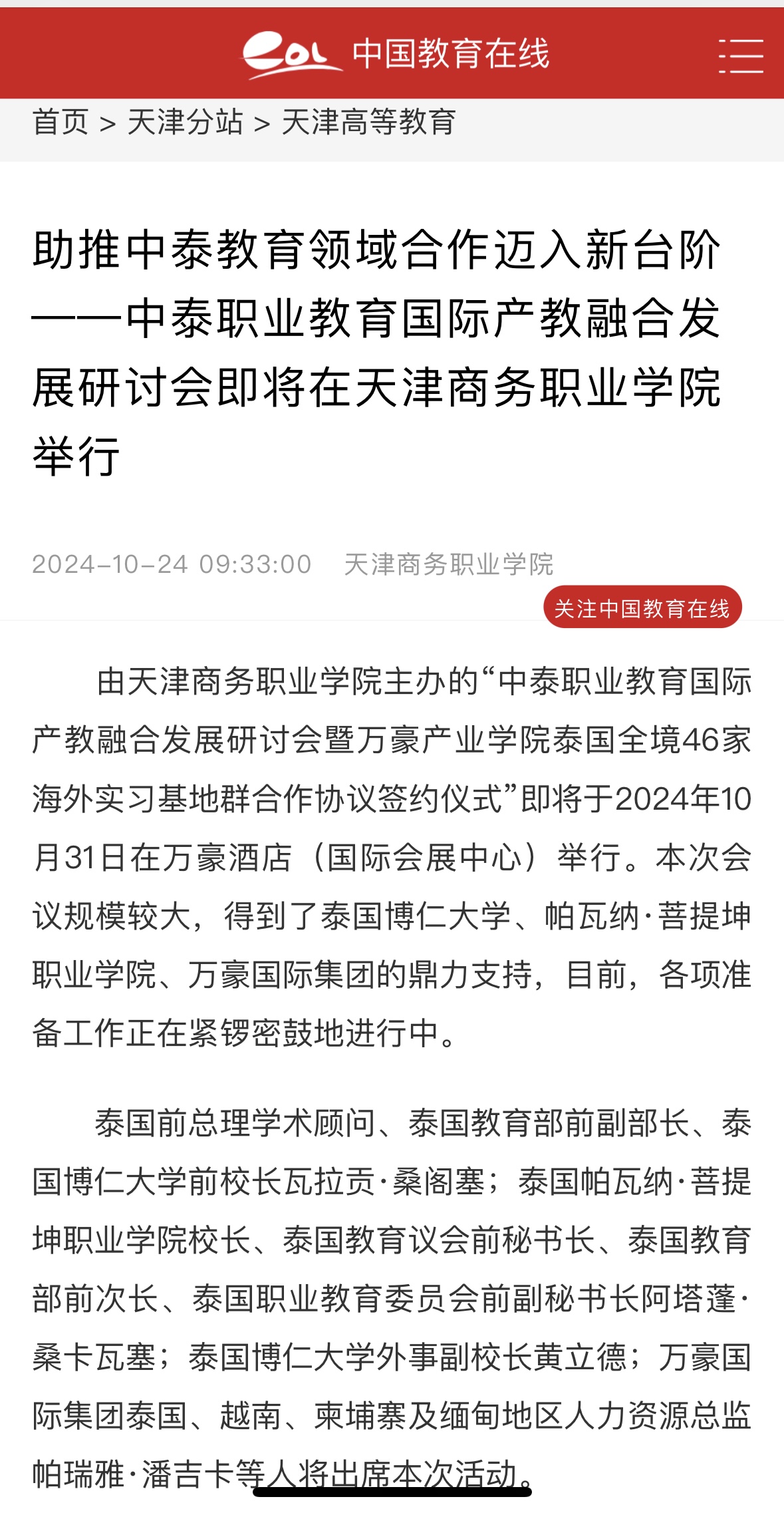 媒體關(guān)注 | 【中國教育在線】助推中泰教育領(lǐng)域合作邁入新臺(tái)階——中泰職業(yè)教育國際產(chǎn)教融合發(fā)展研討會(huì)即將在天津商務(wù)職業(yè)學(xué)院舉行