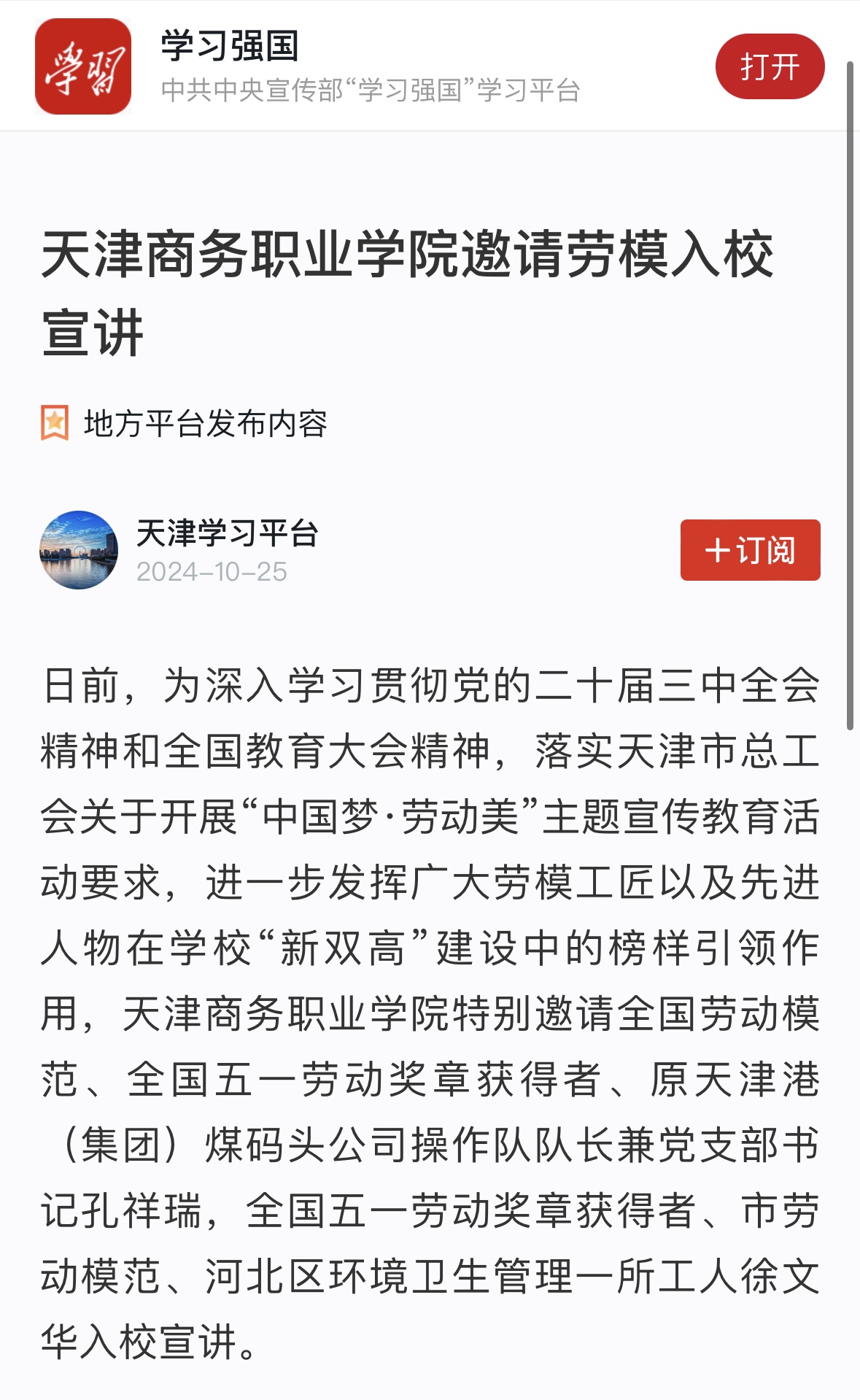 媒體關(guān)注 | 【學(xué)習(xí)強(qiáng)國】天津商務(wù)職業(yè)學(xué)院邀請(qǐng)勞模入校宣講
