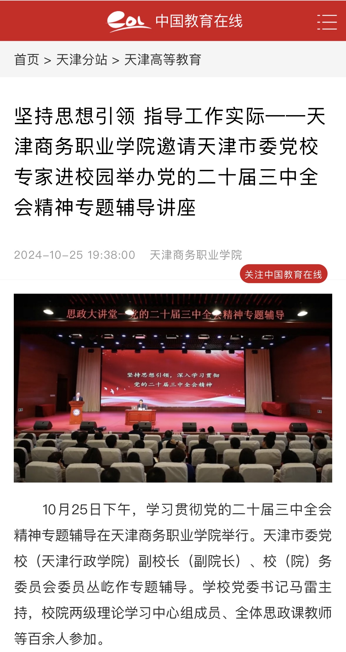 媒體關注 | 【中國教育在線】天津商務職業學院邀請天津市委黨校專家進校園舉辦黨的二十屆三中全會精神專題輔導講座