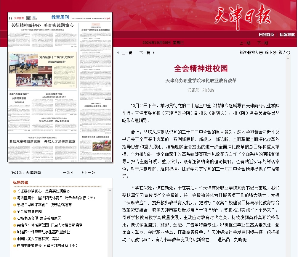 “學在深處,謀在新處,干在實處。”天津商務職業學院黨委書記馬雷說,我們要認真學習宣傳貫徹全會精神,將全會精神轉化為開展各項工作的強大動力,發揮“頭雁效應”,提升教師教書育人能力,把對標“雙高”校建設目標與深化教育綜合改革緊密結合,聚焦天津市高質量發展“十項行動”,積極推進實施“七個起來”,引領學校教育教學高質量發展,主動應對教育時代之變。持續發揮商科高職院校作用,做優做強國貿、旅游、金融、廣告等特色專業,積極推進畢業生高質量就業。聚焦育人重點、突出職業特點、打造商務經典,與天津經濟社會發展同頻共振,積極推動“職教出海”,奮力書寫改革發展商職新答卷。