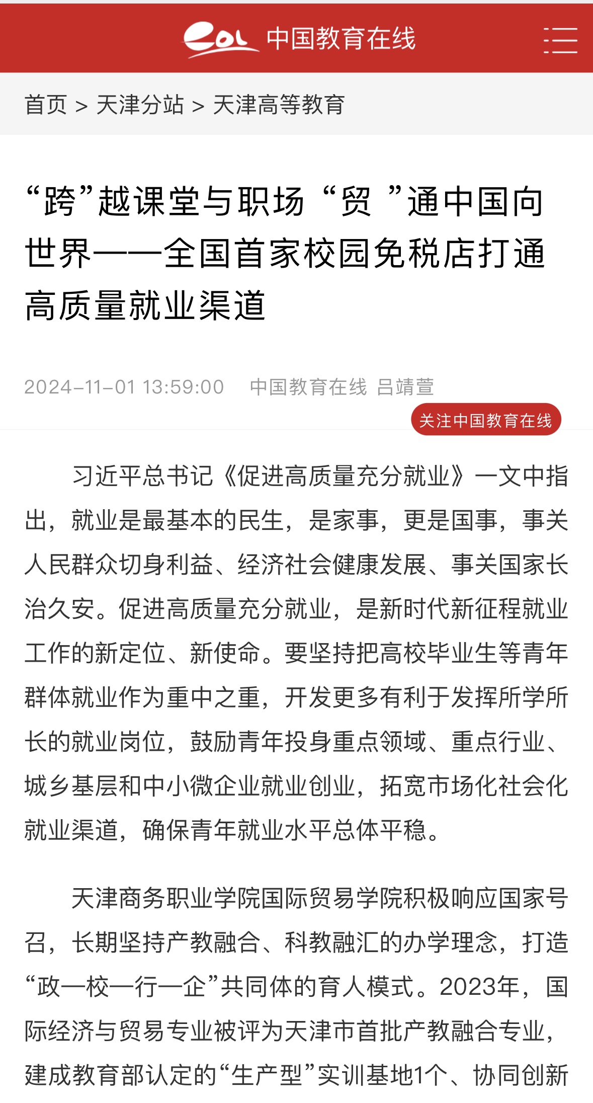 媒體關注 | 【中國教育在線】“跨”越課堂與職場 “貿”通中國向世界——全國首家校園免稅店打通高質量就業渠道