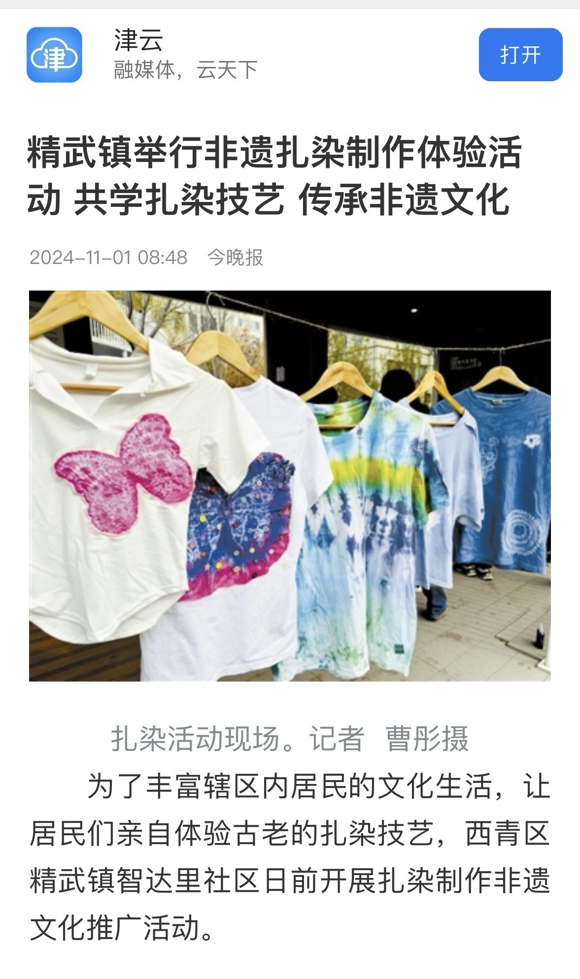 為了豐富轄區(qū)內(nèi)居民的文化生活,讓居民們親自體驗(yàn)古老的扎染技藝,西青區(qū)精武鎮(zhèn)智達(dá)里社區(qū)日前開展扎染制作非遺文化推廣活動(dòng)。