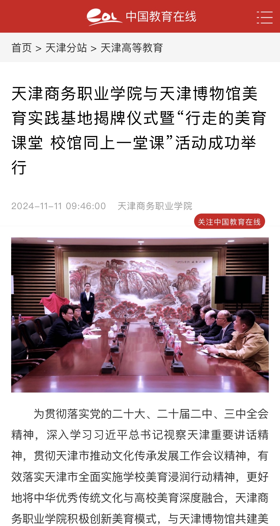 2024年11月6日,天津商務職業學院與天津博物館美育共建簽約授牌儀式在天津博物館舉行。天津博物館黨委副書記、館長姚旸,宣教部主任、市文博學會副秘書長李玫,天津商務職業學院黨委書記馬雷,副校長武春平,黨委辦公室、德育教學部相關負責同志以及部分教師和學生代表參加了此次活動。