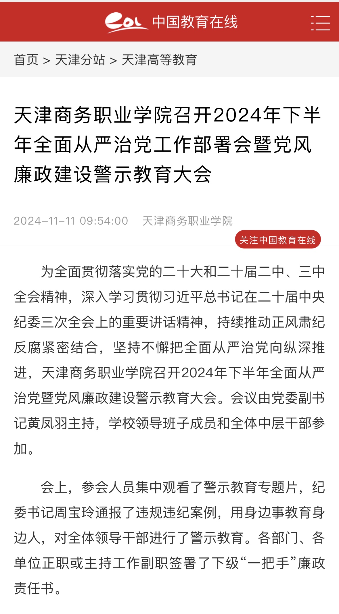 為全面貫徹落實(shí)黨的二十大和二十屆二中、三中全會精神,深入學(xué)習(xí)貫徹習(xí)近平總書記在二十屆中央紀(jì)委三次全會上的重要講話精神,持續(xù)推動正風(fēng)肅紀(jì)反腐緊密結(jié)合,堅持不懈把全面從嚴(yán)治黨向縱深推進(jìn),天津商務(wù)職業(yè)學(xué)院召開2024年下半年全面從嚴(yán)治黨暨黨風(fēng)廉政建設(shè)警示教育大會。會議由黨委副書記黃鳳羽主持,學(xué)校領(lǐng)導(dǎo)班子成員和全體中層干部參加。 會上,參會人員集中觀看了警示教育專題片,紀(jì)委書記周寶玲通報了違規(guī)違紀(jì)案例,用身邊事教育身邊人,對全體領(lǐng)導(dǎo)干部進(jìn)行了警示教育。各部門、各單位正職或主持工作副職簽署了下級“一把手”廉政責(zé)任書。