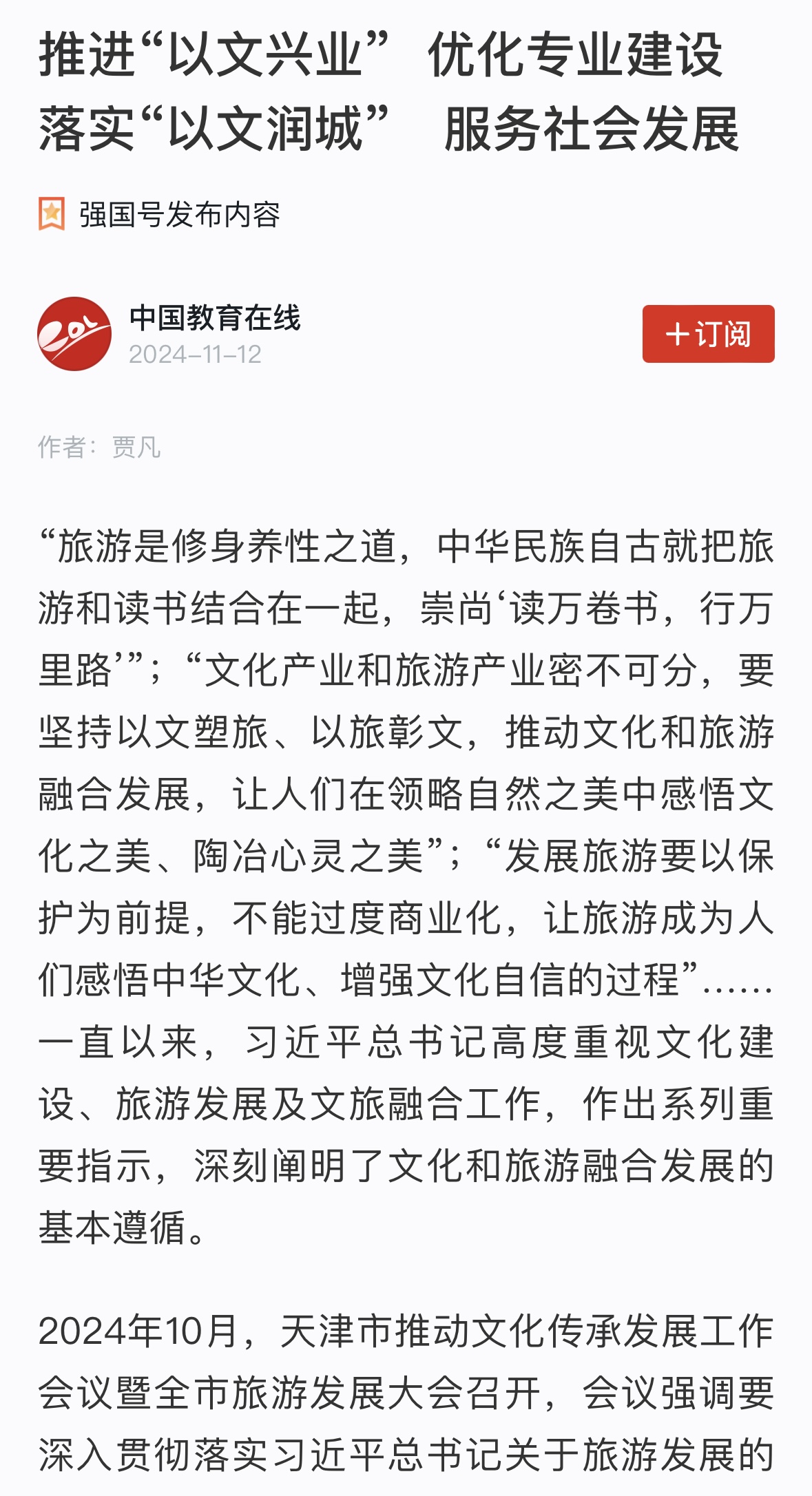 2024年10月,天津市推動文化傳承發展工作會議暨全市旅游發展大會召開,會議強調要深入貫徹落實習近平總書記關于旅游發展的重要論述,堅持以文塑旅、以旅彰文,因地制宜、因勢利導,加快建設都市型、體驗式、年輕態、人文韻特色鮮明的文化旅游目的地。