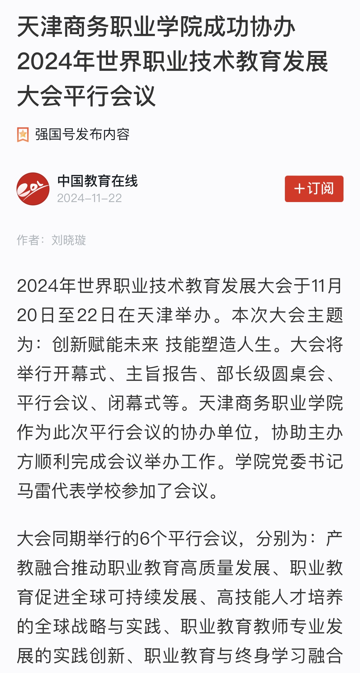 2024年世界職業技術教育發展大會于11月20日至22日在天津舉辦。本次大會主題為:創新賦能未來 技能塑造人生。大會將舉行開幕式、主旨報告、部長級圓桌會、平行會議、閉幕式等。天津商務職業學院作為此次平行會議的協辦單位,協助主辦方順利完成會議舉辦工作。學院黨委書記馬雷代表學校參加了會議。