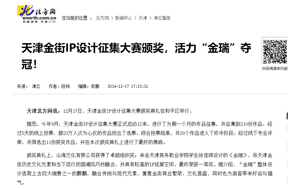 頒獎典禮上,山海文化有限公司獲得了卓越組織獎;來自天津商務職業學院學生徐佳琪設計的《金瑞》,將天津金街歷史文化元素和當下流行的國潮風巧妙融合,并具有較高的IP延展空間,最終榮獲一等獎。據介紹,“金瑞”整體設計選取上古四大瑞獸之一的麒麟,融合傳統與現代元素,寓意金街商業繁榮、文化昌盛,同時也為游客帶來好運與福氣。