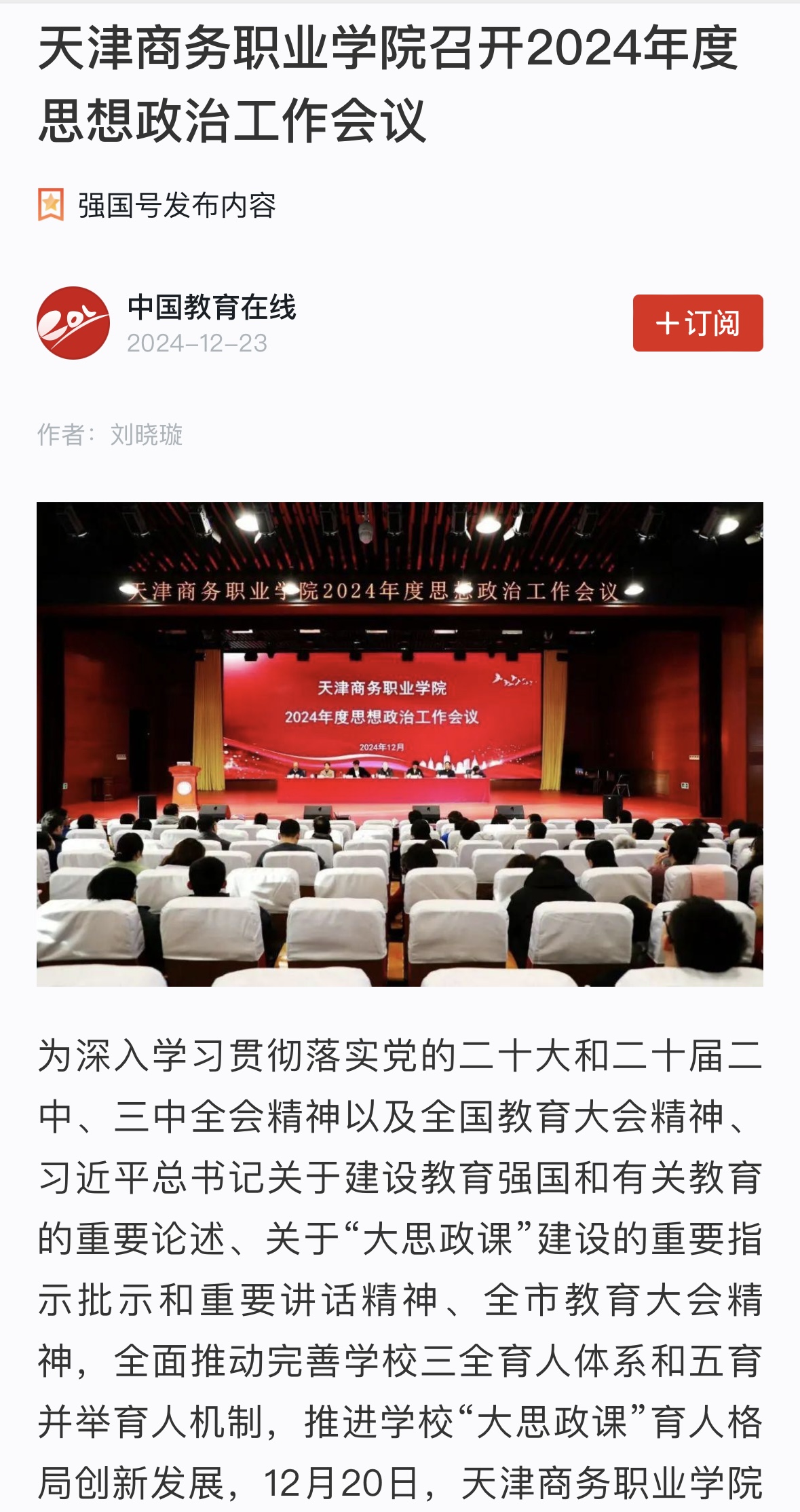會議強調,全面加強黨對教育工作的領導,聚焦思政導向和育人取向,推動學校黨建和思想政治工作守正創新,不斷完善黨委統一領導、黨政齊抓共管、部門各負其責的“大思政課”育人格局的機制,持續超前布局、有力應對變局、奮力開拓新局,不斷深化職普融通、產教融合、科教融匯,不斷提升學校核心競爭力、提高人才培養質量,為天津市現代化大都市和教育強市建設源源不斷提供高素質技術技能人才。