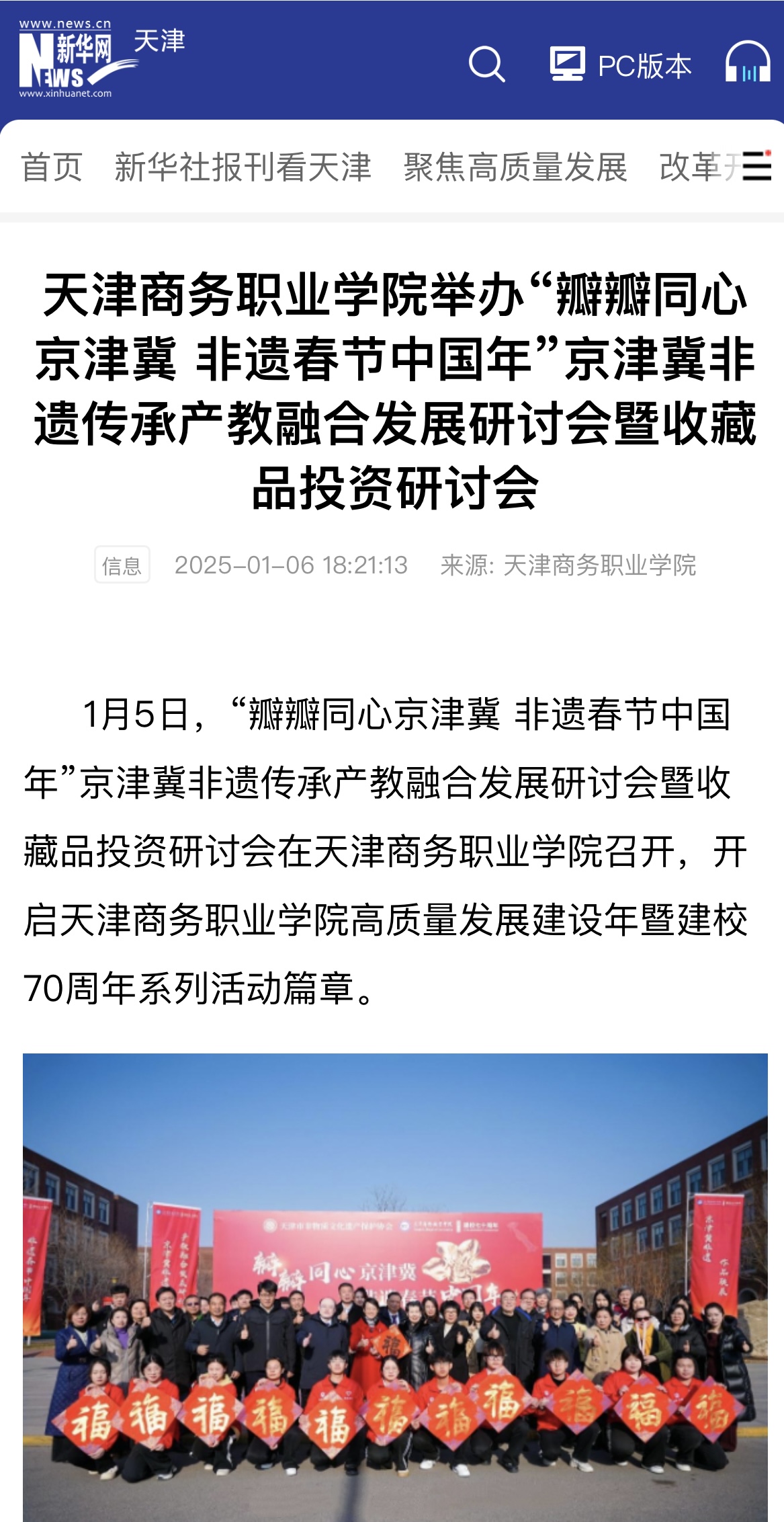媒體關注 | 【新華網】天津商務職業學院舉辦“瓣瓣同心京津冀 非遺春節中國年”京津冀非遺傳承產教融合發展研討會暨收藏品投資研討會 | 高質量發展建設年暨建校70周年
