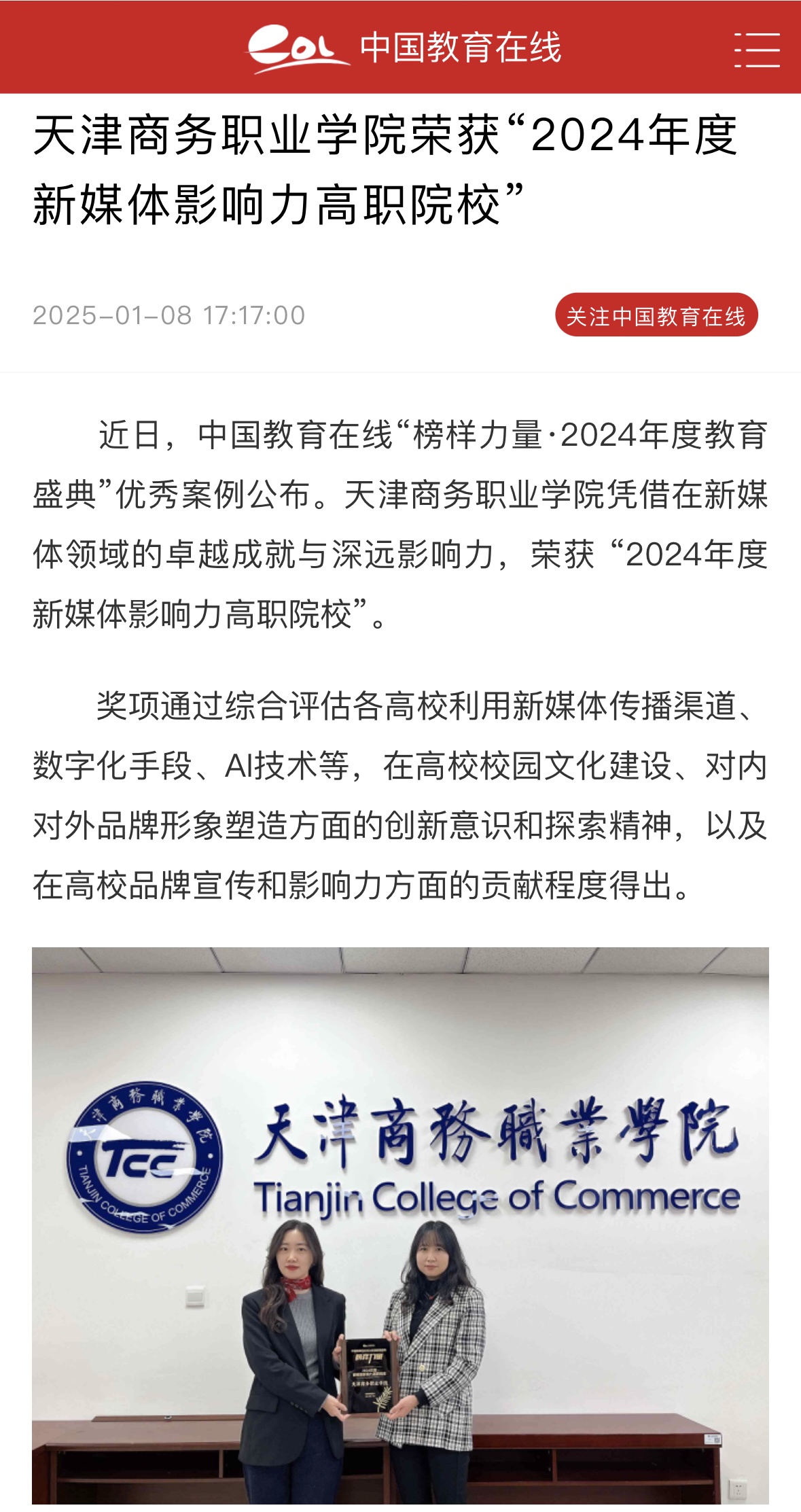 近日,中國教育在線“榜樣力量·2024年度教育盛典”優秀案例公布。天津商務職業學院憑借在新媒體領域的卓越成就與深遠影響力,榮獲 “2024年度新媒體影響力高職院校”。
