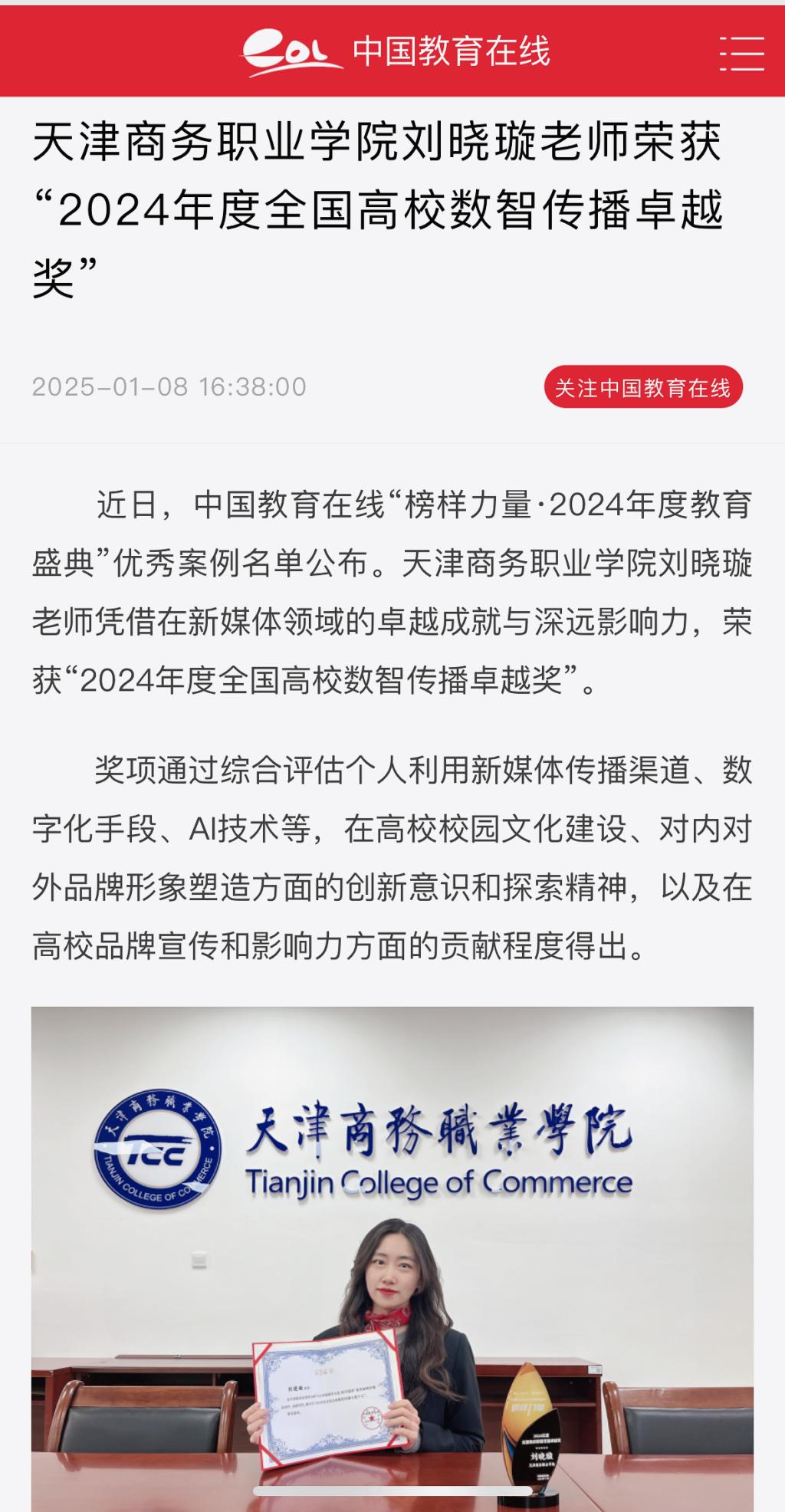 媒體關(guān)注 | 【中國(guó)教育在線】天津商務(wù)職業(yè)學(xué)院劉曉璇老師榮獲“2024年度全國(guó)高校數(shù)智傳播卓越獎(jiǎng)” | 喜報(bào)