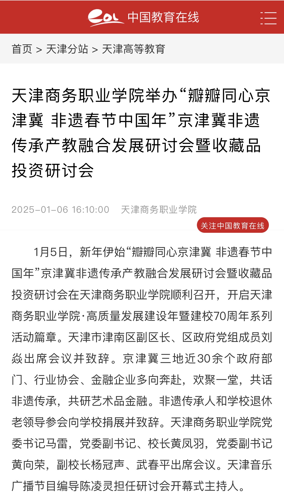 1月5日,新年伊始“瓣瓣同心京津冀 非遺春節(jié)中國年”京津冀非遺傳承產(chǎn)教融合發(fā)展研討會暨收藏品投資研討會在天津商務(wù)職業(yè)學院順利召開,開啟天津商務(wù)職業(yè)學院·高質(zhì)量發(fā)展建設(shè)年暨建校70周年系列活動篇章。天津市津南區(qū)副區(qū)長、區(qū)政府黨組成員劉焱出席會議并致辭。京津冀三地近30余個政府部門、行業(yè)協(xié)會、金融企業(yè)多向奔赴,歡聚一堂,共話非遺傳承,共研藝術(shù)品金融。非遺傳承人和學校退休老領(lǐng)導(dǎo)參會向?qū)W校捐展并致辭。天津商務(wù)職業(yè)學院黨委書記馬雷,黨委副書記、校長黃鳳羽,黨委副書記黃向榮,副校長楊冠聲、武春平出席會議。天津音樂廣播節(jié)目編導(dǎo)陳凌靈擔任研討會開幕式主持人。
