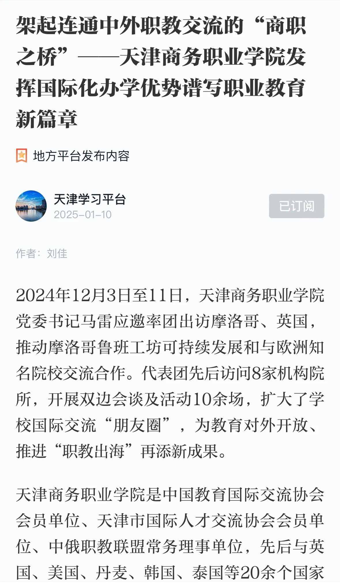 2024年12月3日至11日,天津商務(wù)職業(yè)學(xué)院黨委書記馬雷應(yīng)邀率團(tuán)出訪摩洛哥、英國,推動摩洛哥魯班工坊可持續(xù)發(fā)展和與歐洲知名院校交流合作。代表團(tuán)先后訪問8家機(jī)構(gòu)院所,開展雙邊會談及活動10余場,擴(kuò)大了學(xué)校國際交流“朋友圈”,為教育對外開放、推進(jìn)“職教出海”再添新成果。