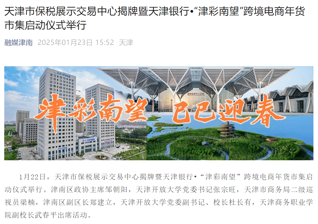 1月22日,天津市保稅展示交易中心揭牌暨天津銀行?“津彩南望”跨境電商年貨市集啟動(dòng)儀式舉行。津南區(qū)政協(xié)主席鄒朝陽(yáng),天津開放大學(xué)黨委書記張宗旺,天津市商務(wù)局二級(jí)巡視員梁楠,津南區(qū)副區(qū)長(zhǎng)鄭建立,天津開放大學(xué)黨委副書記、校長(zhǎng)杜長(zhǎng)有,天津商務(wù)職業(yè)學(xué)院副校長(zhǎng)武春平出席活動(dòng)。