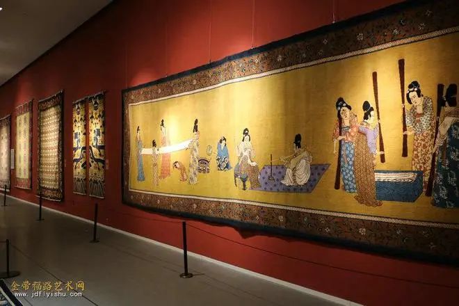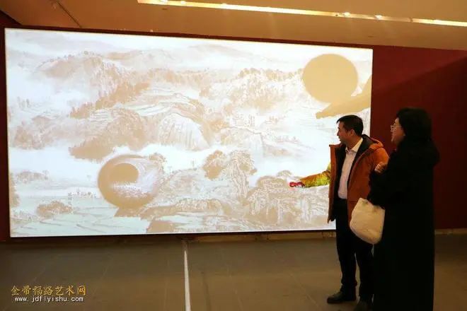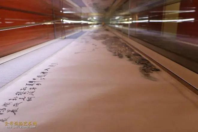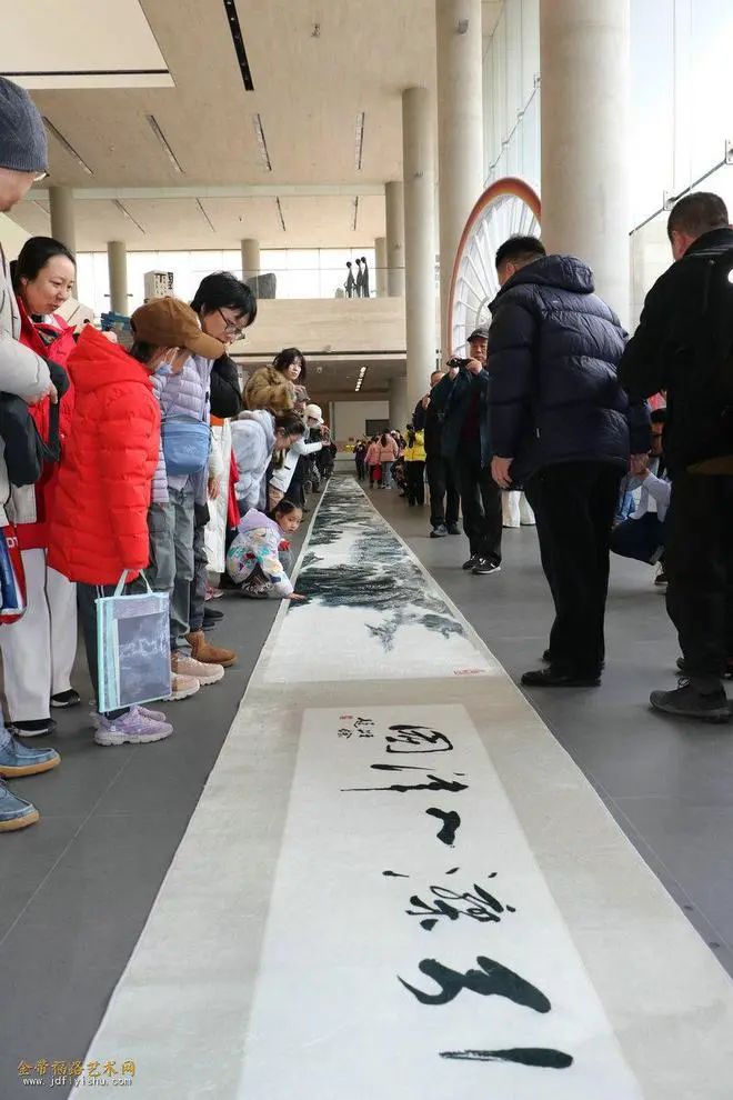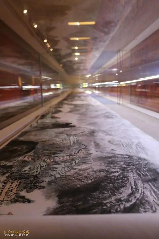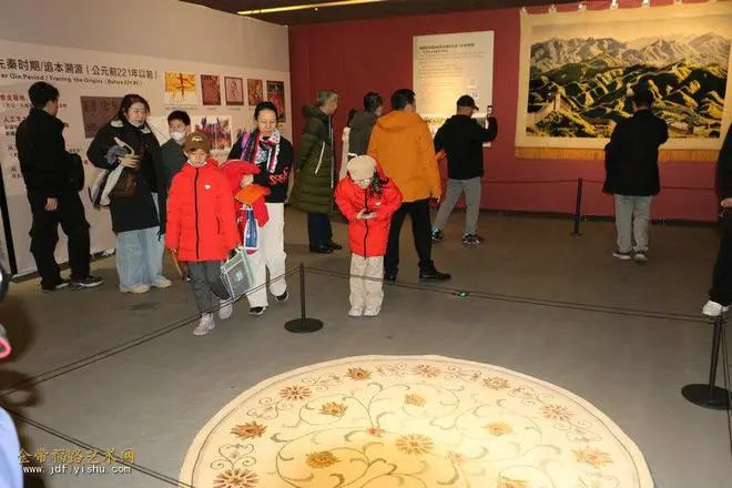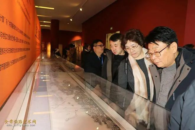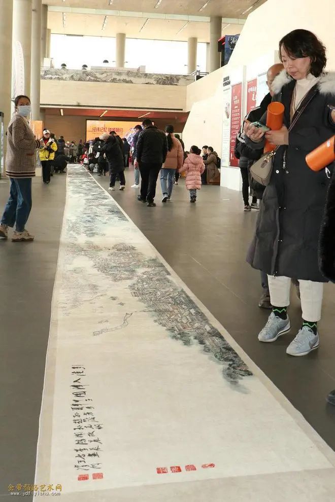 展覽現場,近50米的《引灤入津圖》1:1復刻地毯震撼亮相,開幕式上,在各界嘉賓共同見證下,長毯緩緩展開,氣勢恢宏。復刻長毯還被鋪設至三樓展廳,方便觀眾近距離品味其精湛工藝與細膩筆觸。