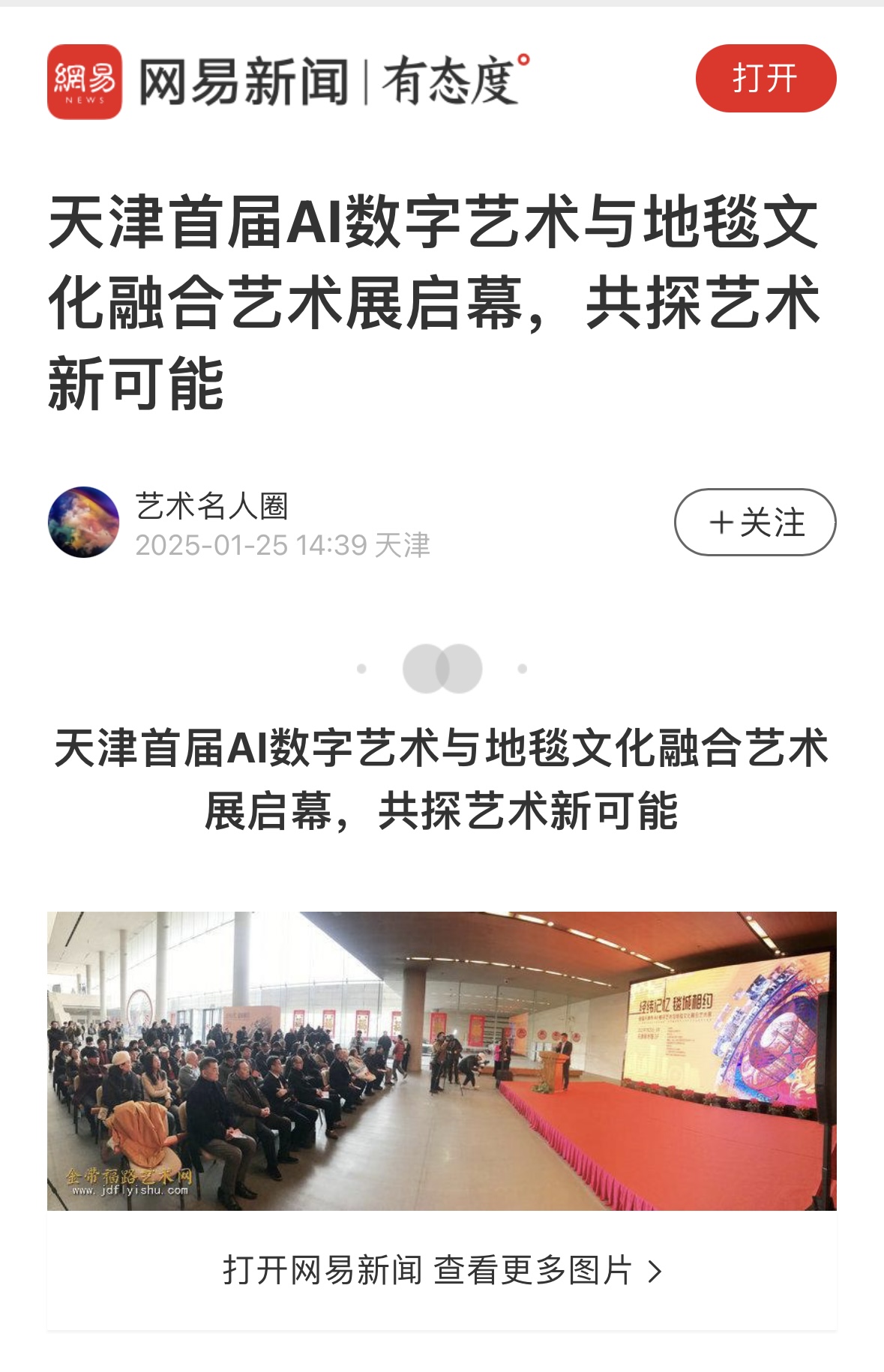 網訊2025年1月25日,《經緯記憶?毯城相約——天津市首屆AI數字藝術與地毯文化融合藝術展》在天津美術館盛大開幕。此次展覽由天津昌盛文化有限公司聯合天津市武清區織采宮-崔黃口國際地毯文化展覽館、重明鳥(天津)知識產權運營管理有限責任公司及天津市高職教育院校共同策劃舉辦,旨在順應生成式人工智能(AIGC)技術發展潮流,聚焦“AI為人民生活服務”,探索AI數字藝術與傳統地毯文化融合的無限潛力。
