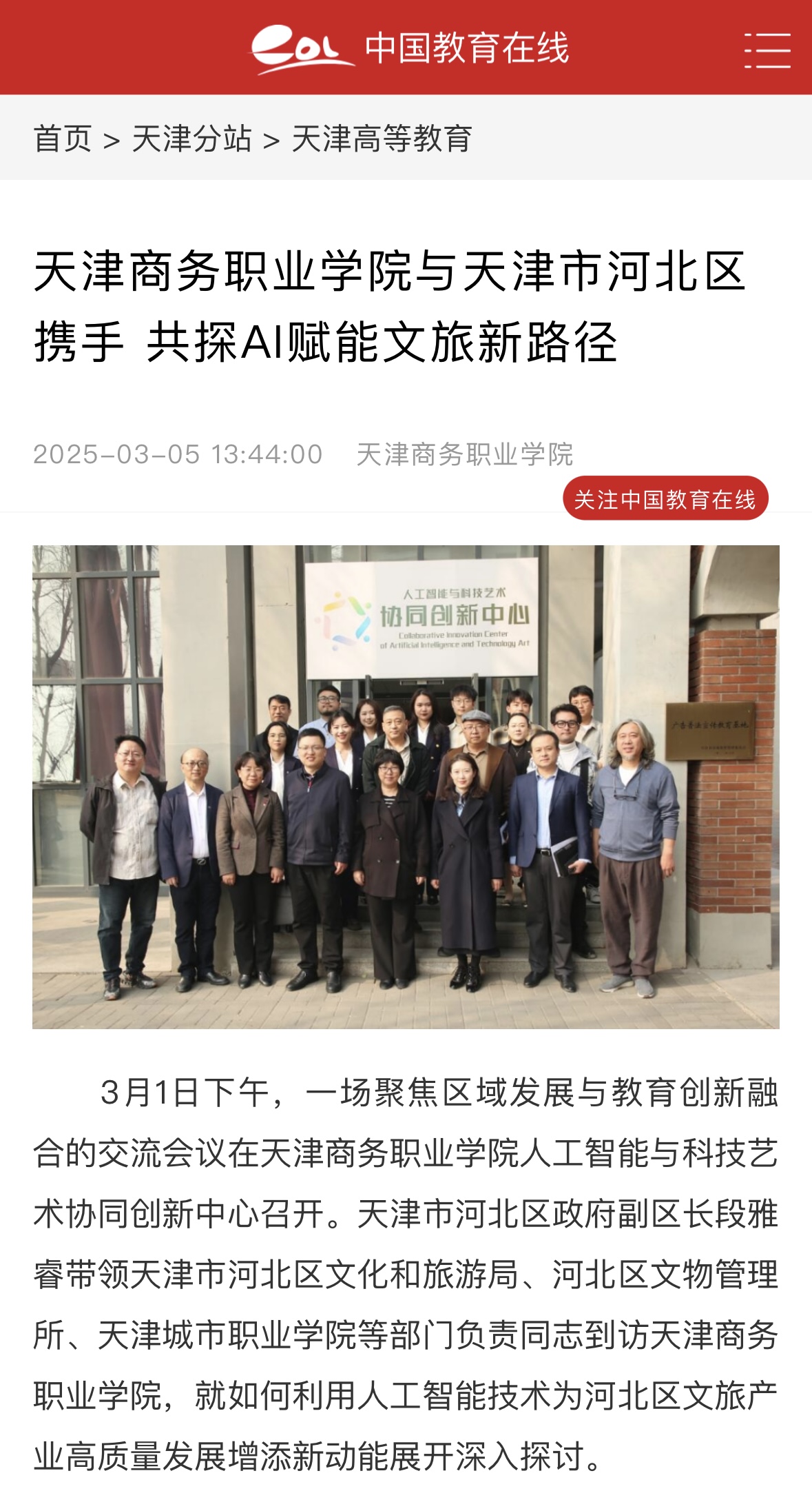 媒體關注 | 【中國教育在線】天津商務職業學院與天津市河北區攜手 共探AI賦能文旅新路徑