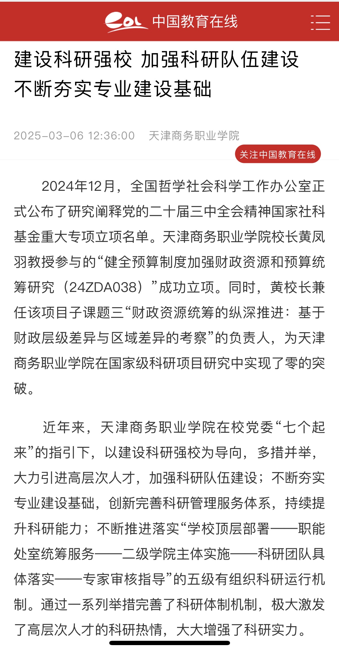 2024年12月,全國哲學社會科學工作辦公室正式公布了研究闡釋黨的二十屆三中全會精神國家社科基金重大專項立項名單。天津商務職業學院校長黃鳳羽教授參與的“健全預算制度加強財政資源和預算統籌研究(24ZDA038)”成功立項。同時,黃校長兼任該項目子課題三“財政資源統籌的縱深推進:基于財政層級差異與區域差異的考察”的負責人,為天津商務職業學院在國家級科研項目研究中實現了零的突破。