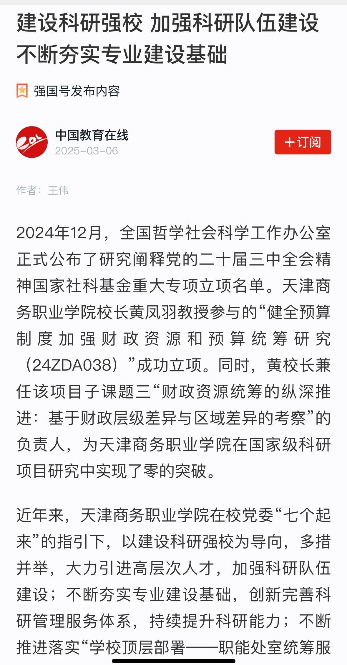 2024年12月,全國哲學社會科學工作辦公室正式公布了研究闡釋黨的二十屆三中全會精神國家社科基金重大專項立項名單。天津商務職業學院校長黃鳳羽教授參與的“健全預算制度加強財政資源和預算統籌研究(24ZDA038)”成功立項。同時,黃校長兼任該項目子課題三“財政資源統籌的縱深推進:基于財政層級差異與區域差異的考察”的負責人,為天津商務職業學院在國家級科研項目研究中實現了零的突破。