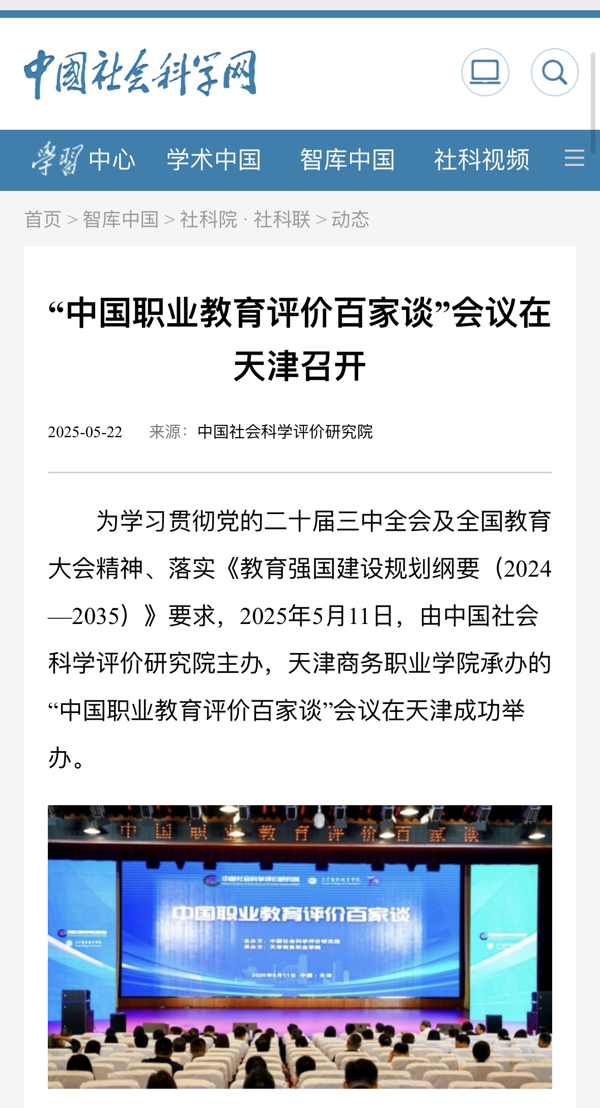 為學習貫徹黨的二十屆三中全會及全國教育大會精神、落實《教育強國建設規劃綱要(2024—2035)》要求,2025年5月11日,由中國社會科學評價研究院主辦,天津商務職業學院承辦的“中國職業教育評價百家談”會議在天津成功舉辦。