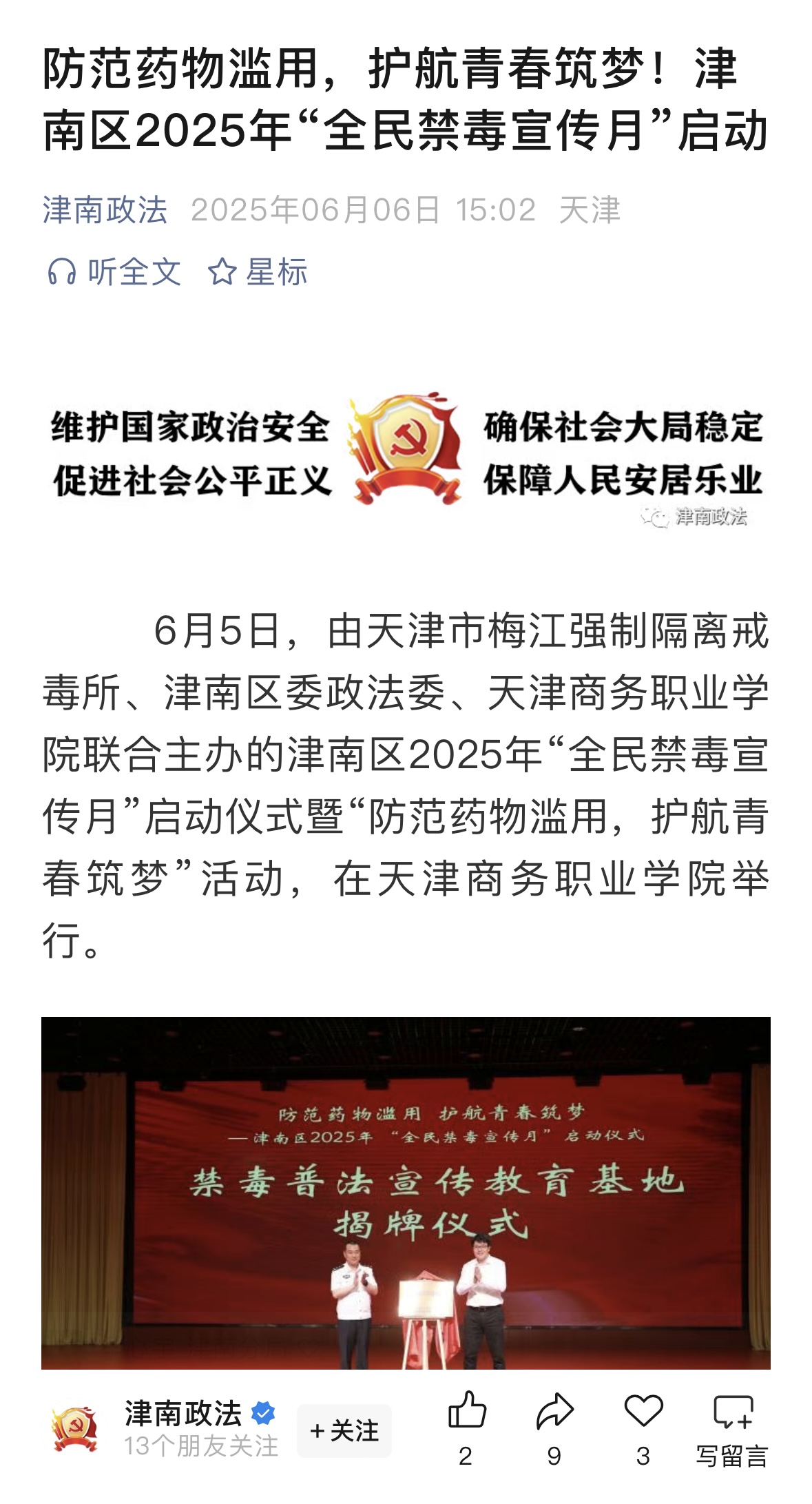 6月5日,由天津市梅江強制隔離戒毒所、津南區委政法委、天津商務職業學院聯合主辦的津南區2025年“全民禁毒宣傳月”啟動儀式暨“防范藥物濫用,護航青春筑夢”活動,在天津商務職業學院舉行。