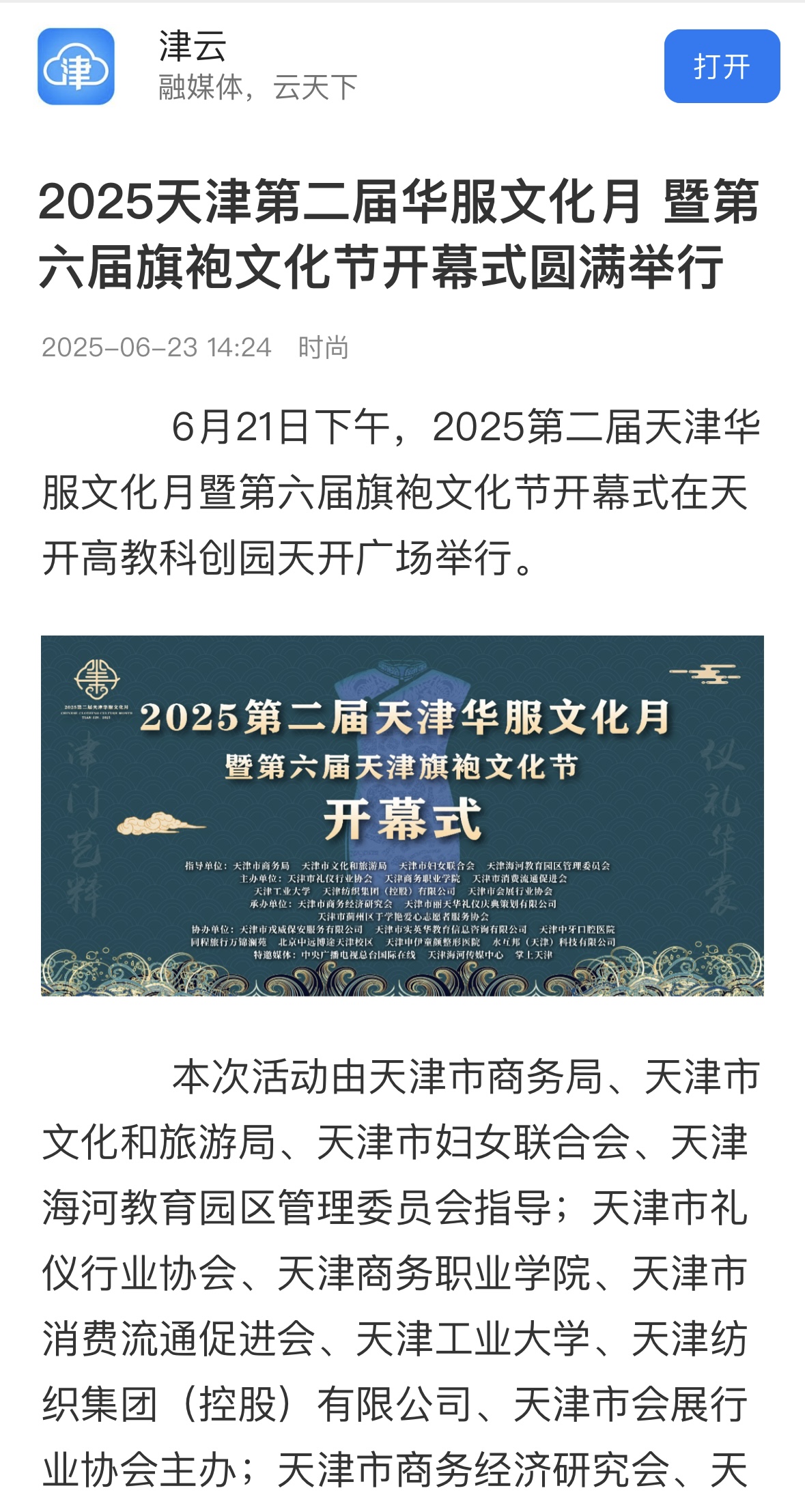 6月21日下午,2025第二屆天津華服文化月暨第六屆旗袍文化節(jié)開幕式在天開高教科創(chuàng)園天開廣場舉行。