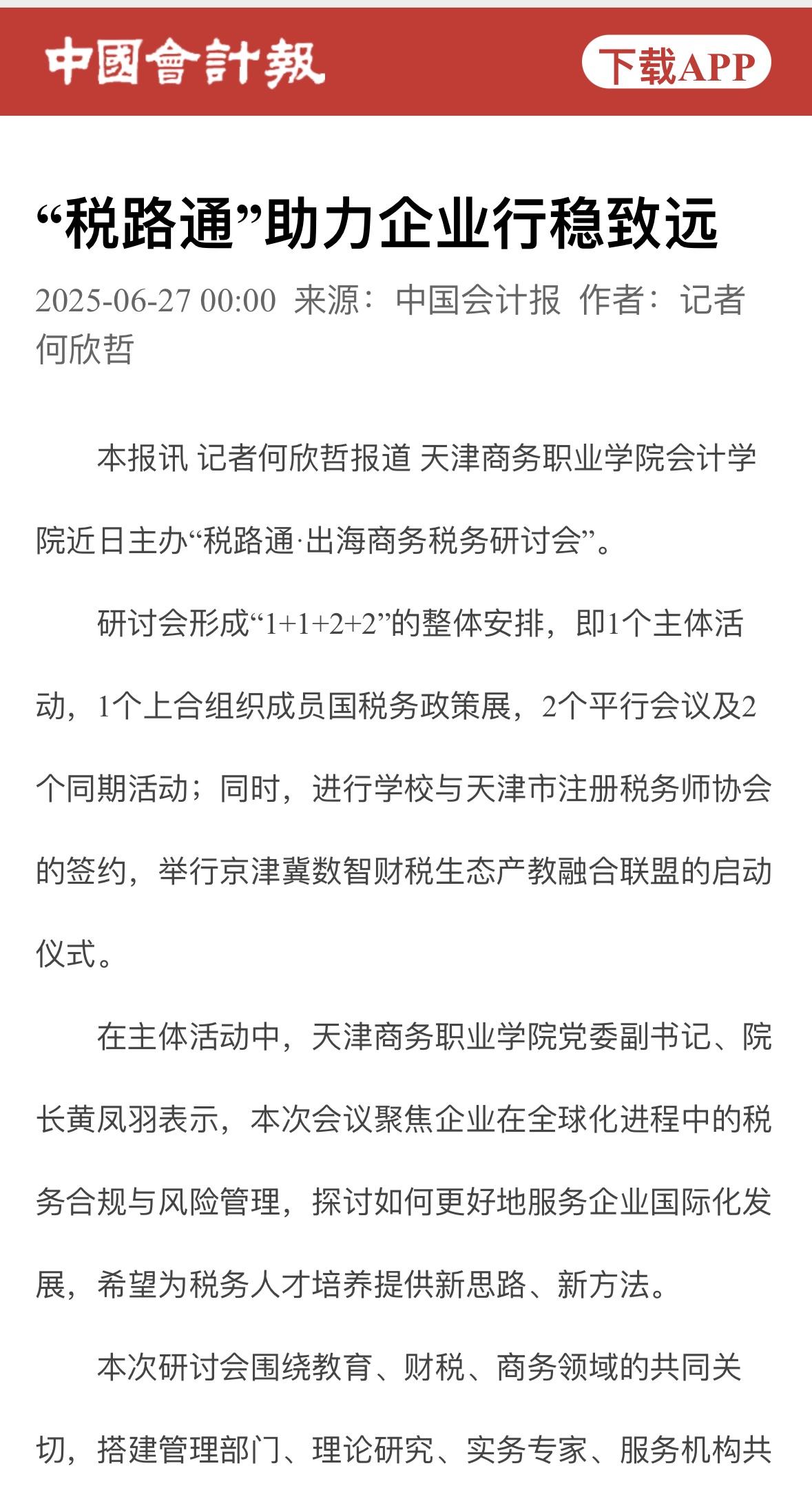 本報訊 記者何欣哲報道 天津商務職業學院會計學院近日主辦“稅路通·出海商務稅務研討會”。