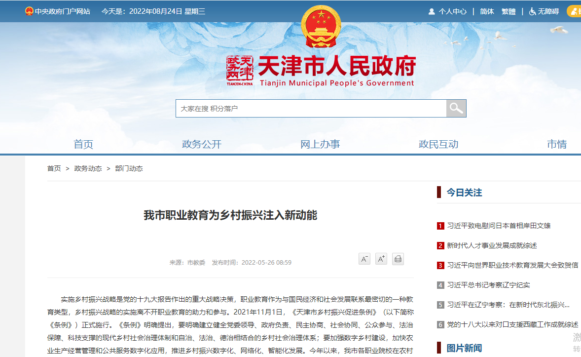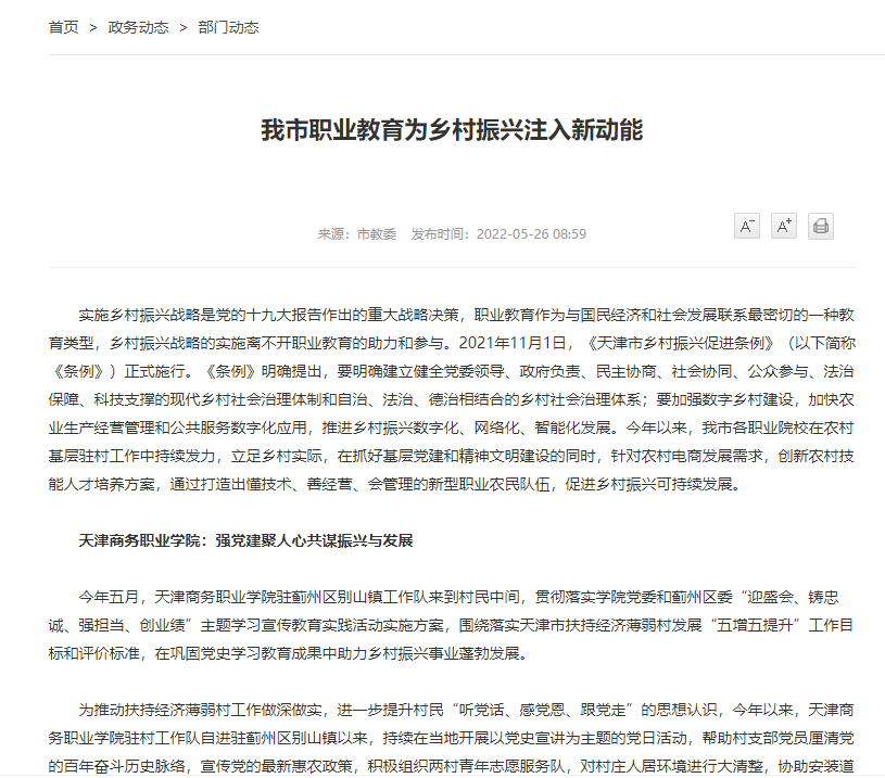 媒體關(guān)注 | 天津市人民政府官網(wǎng)發(fā)布:我市職業(yè)教育為鄉(xiāng)村振興注入新動能 談及我校多措并舉做深做實扶持經(jīng)濟薄弱村工作