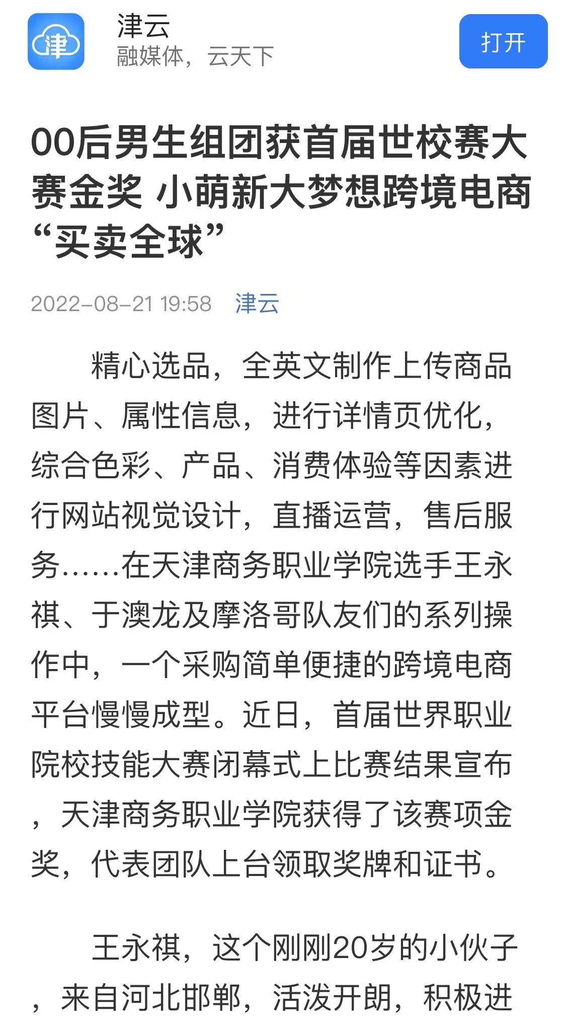 精心選品,全英文制作上傳商品圖片、屬性信息,進行詳情頁優(yōu)化,綜合色彩、產(chǎn)品、消費體驗等因素進行網(wǎng)站視覺設(shè)計,直播運營,售后服務(wù)……在天津商務(wù)職業(yè)學(xué)院選手王永祺、于澳龍及摩洛哥隊友們的系列操作中,一個采購簡單便捷的跨境電商平臺慢慢成型。近日,首屆世界職業(yè)院校技能大賽閉幕式上比賽結(jié)果宣布,天津商務(wù)職業(yè)學(xué)院獲得了該賽項金獎,代表團隊上臺領(lǐng)取獎牌和證書。