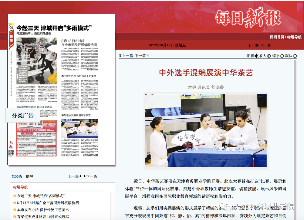 近日,中華茶藝賽項在天津商務職業學院開賽。此次大賽旨在打造“比賽、展示和體驗”三位一體的國際化賽事,搭建中外職教師生增進友誼、切磋技能、展示風采的國際平臺,增強我國在國際職業教育領域的話語權和影響力。