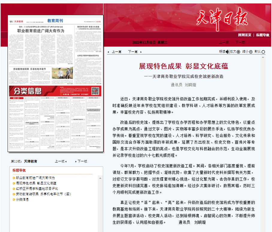 《天津日報》原文鏈接:展現特色成果 彰顯文化底蘊──天津商務職業學院完成校史館更新改造