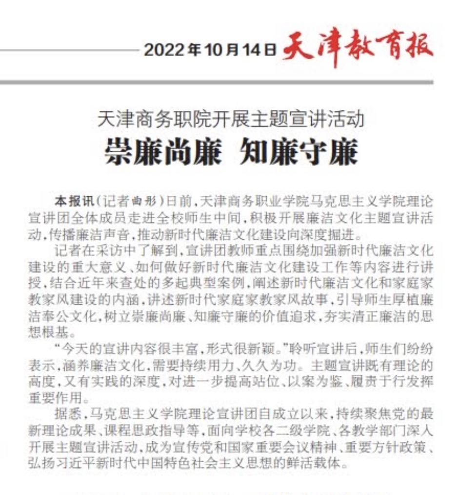 本報訊(記者曲彤)日前,天津商務職業學院馬克思主義學院理論宣講團全體成員走進全校師生中間,積極開展廉潔文化主題宣講活動,傳播廉潔聲音,推動新時代廉潔文化建設向深度掘進。