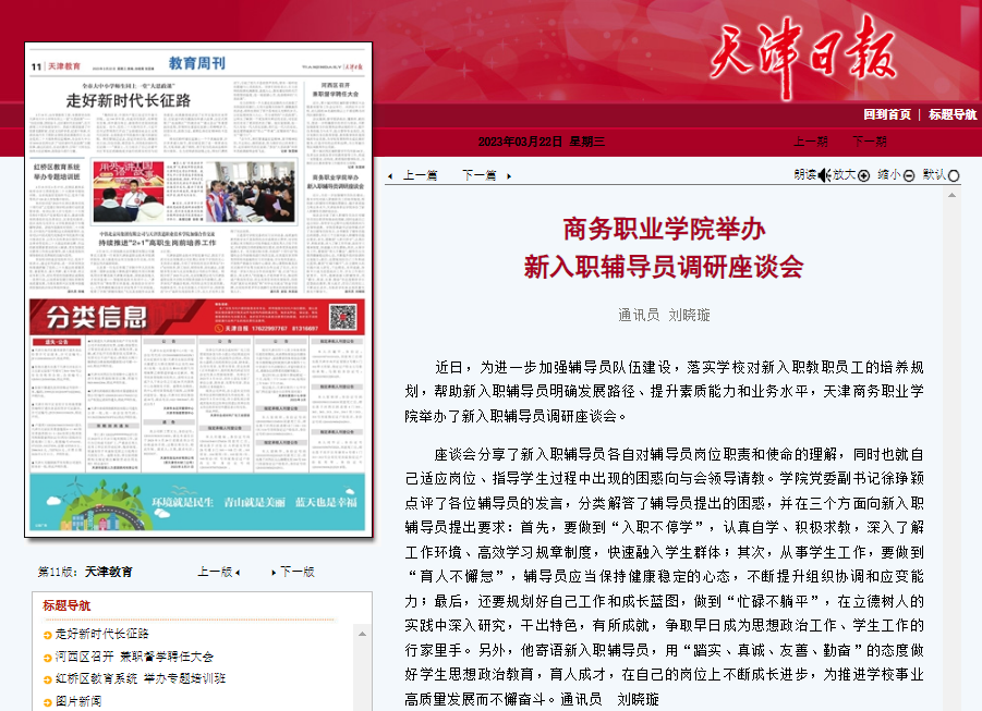 媒體關注 | 《天津日報》報道我校舉辦新入職輔導員調研座談會