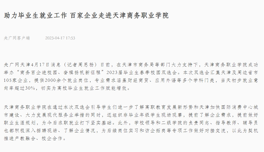 媒體關注 | 《央廣網》報道我校助力畢業生就業 成功舉辦“商務百企進校園、奮楫揚帆新征程”2023屆畢業生春季校園雙選會