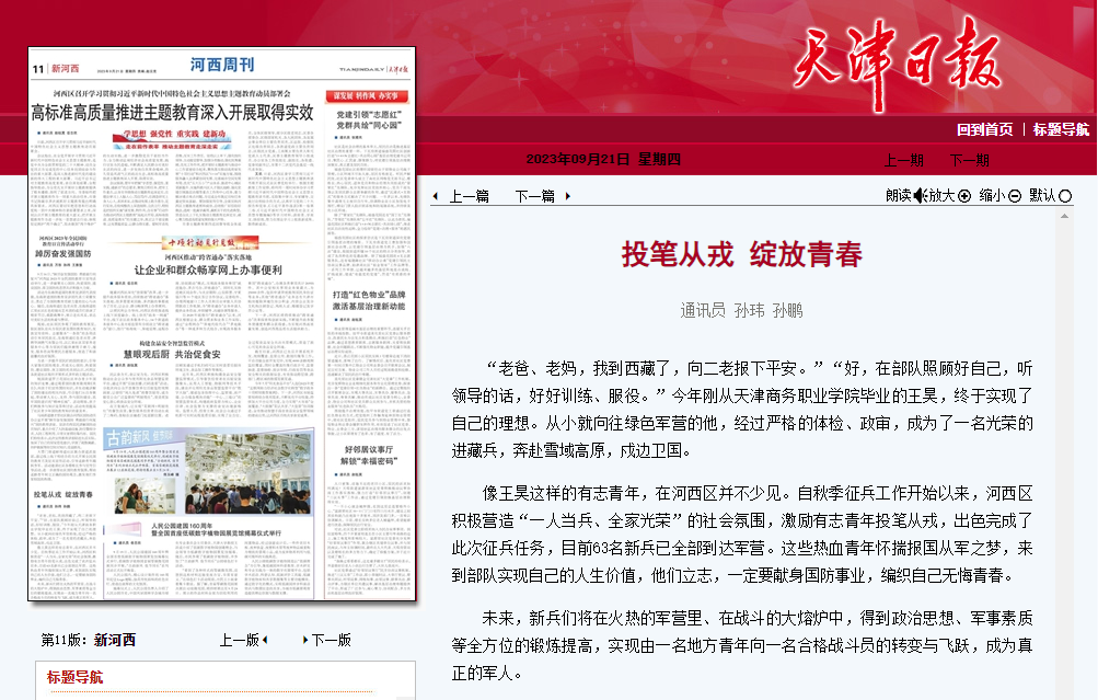 2023年9月21日,《天津日報》第11版報道我校畢業生王昊投筆從戎,成為了一名光榮的進藏兵,奔赴雪域高原,戍邊衛國。