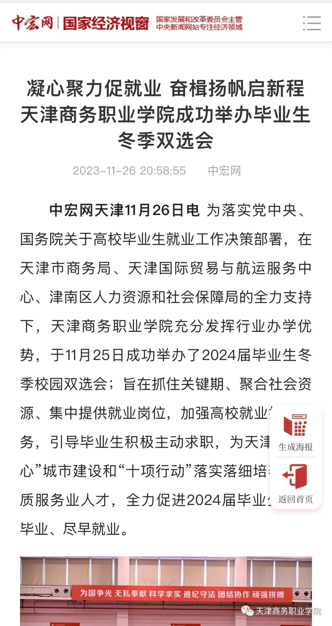中宏網天津11月26日電 為落實黨中央、國務院關于高校畢業生就業工作決策部署,在天津市商務局、天津國際貿易與航運服務中心、津南區人力資源和社會保障局的全力支持下,天津商務職業學院充分發揮行業辦學優勢,于11月25日成功舉辦了2024屆畢業生冬季校園雙選會;旨在抓住關鍵期、聚合社會資源、集中提供就業崗位,加強高校就業指導服務,引導畢業生積極主動求職,為天津“雙中心”城市建設和“十項行動”落實落細培養高素質服務業人才,全力促進2024屆畢業生順利畢業、盡早就業。