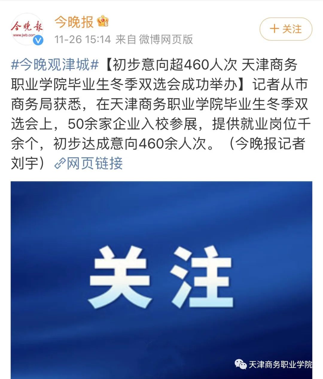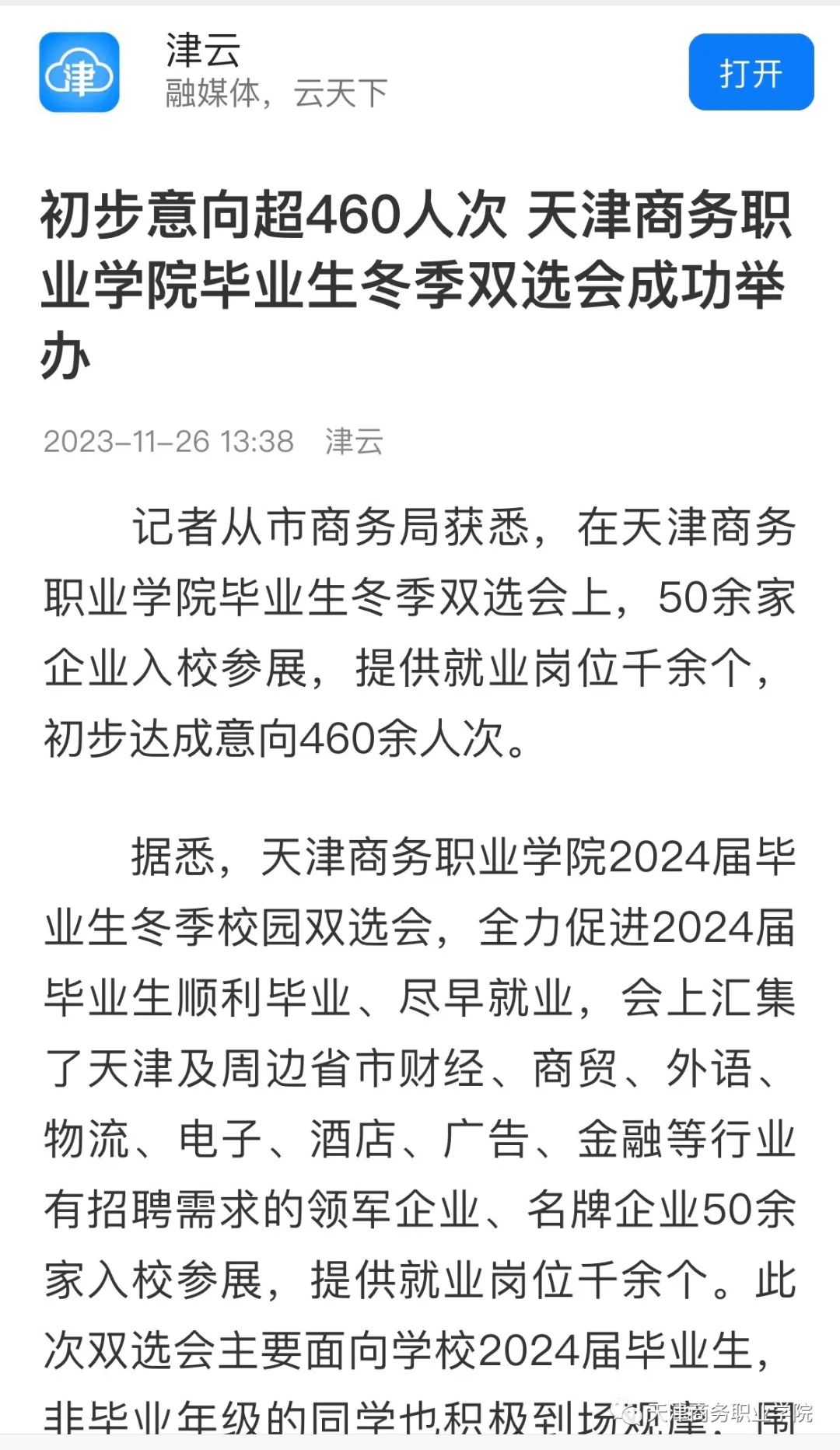 記者從市商務局獲悉,在天津商務職業學院畢業生冬季雙選會上,50余家企業入校參展,提供就業崗位千余個,初步達成意向460余人次。