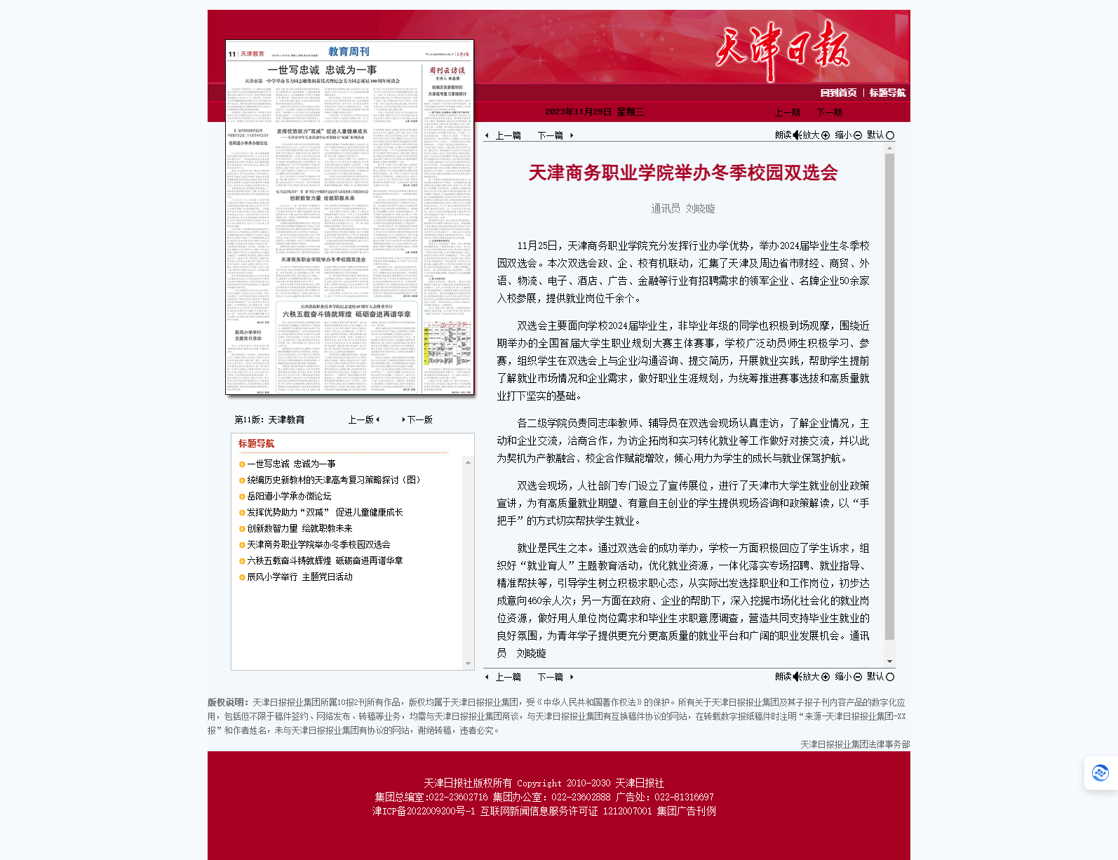11月25日,天津商務職業學院充分發揮行業辦學優勢,舉辦2024屆畢業生冬季校園雙選會。本次雙選會政、企、校有機聯動,匯集了天津及周邊省市財經、商貿、外語、物流、電子、酒店、廣告、金融等行業有招聘需求的領軍企業、名牌企業50余家入校參展,提供就業崗位千余個。