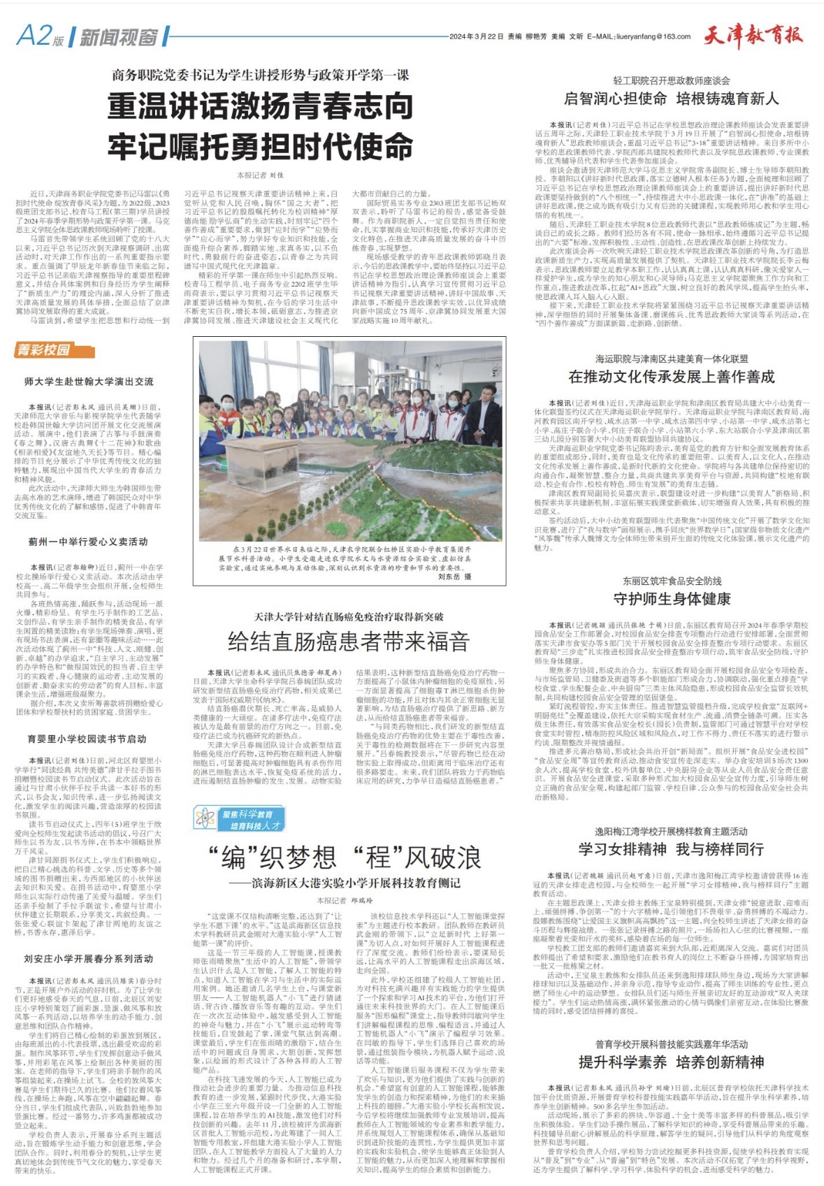 馬雷談到,希望學生把思想和行動統一到習近平總書記視察天津重要講話精神上來,自覺聽從黨和人民召喚,胸懷“國之大者”,把習近平總書記的殷殷囑托轉化為校訓精神“厚德尚能 勵學弘商”的生動實踐,時刻牢記“四個善作善成”重要要求,做到“應時而學”、“應勢而學”、“應心而學”,努力學好專業知識和技能,全面提升綜合素養,腳踏實地、求真務實,以不負時代、勇毅前行的奮進姿態,以青春之為共同譜寫中國式現代化天津篇章。精彩的開學第一課在師生中引起熱烈反響。校青馬工程學員、電子商務專業2202班學生畢雨荷表示,要以學習貫徹習近平總書記視察天津重要講話精神為契機,在今后的學習生活中不斷充實自我,增長本領,砥礪意志,為推進京津冀協同發展,推進天津建設社會主義現代化大都市貢獻自己的力量。國際貿易實務專業2303班團支部書記楊雙雙表示,聆聽了馬雷書記的報告感覺備受鼓舞,作為商職院新人,一定自覺擔當責任和使命,扎實掌握商業知識和技能,傳承好天津歷史文化特色,在推進天津高質量發展的奮斗中歷練青春,實現夢想。現場感受教學的青年思政課教師郭曉月表示,今后的思政課教學中,要始終堅持以習近平總書記在學校思想政治理論課教師座談會上重要講話精神為指引,認真學習宣傳貫徹習近平總書記視察天津重要講話精神,講好中國故事、天津故事,不斷提升思政課教學實效,以優異成績向新中國成立75周年、京津冀協同發展重大國家戰略實施10周年獻禮。