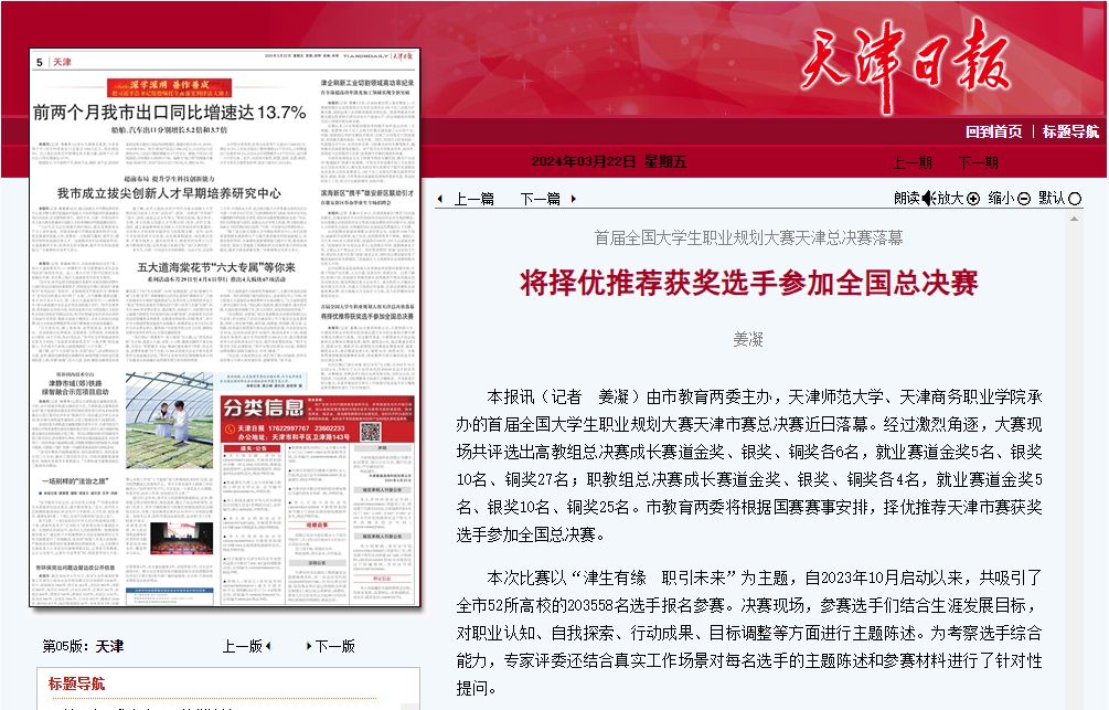 本報訊(記者 姜凝)由市教育兩委主辦,天津師范大學、天津商務職業學院承辦的首屆全國大學生職業規劃大賽天津市賽總決賽近日落幕。經過激烈角逐,大賽現場共評選出高教組總決賽成長賽道金獎、銀獎、銅獎各6名,就業賽道金獎5名、銀獎10名、銅獎27名;職教組總決賽成長賽道金獎、銀獎、銅獎各4名,就業賽道金獎5名、銀獎10名、銅獎25名。市教育兩委將根據國賽賽事安排,擇優推薦天津市賽獲獎選手參加全國總決賽。
