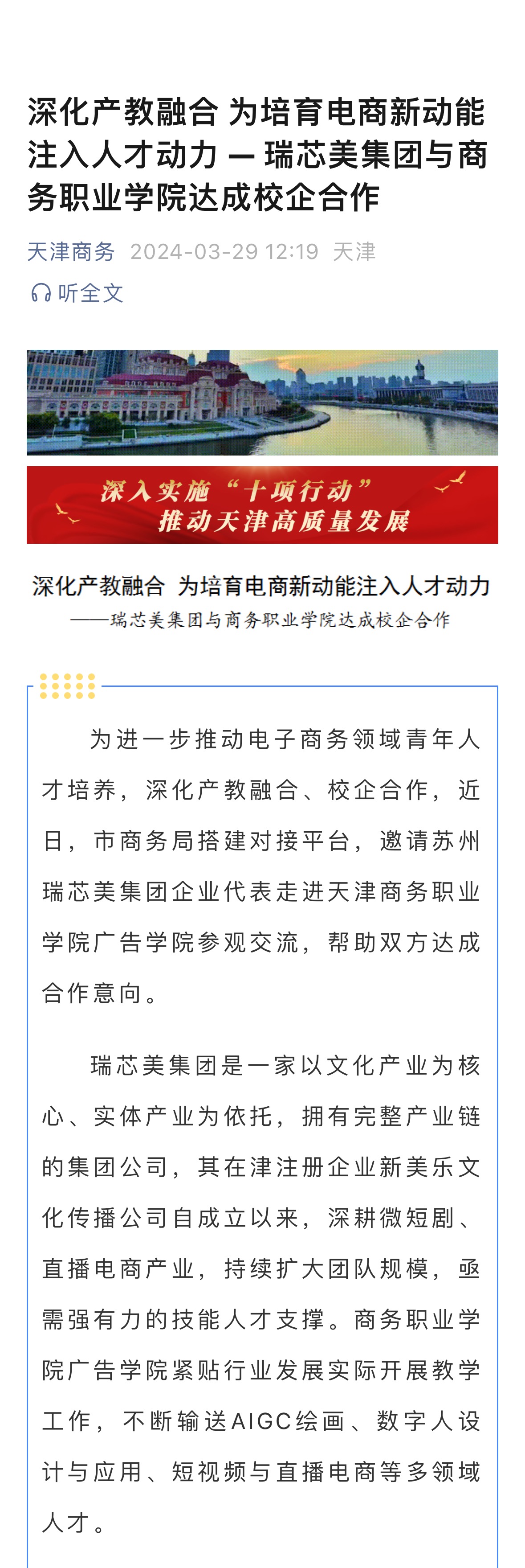 瑞芯美集團是一家以文化產(chǎn)業(yè)為核心、實體產(chǎn)業(yè)為依托,擁有完整產(chǎn)業(yè)鏈的集團公司,其在津注冊企業(yè)新美樂文化傳播公司自成立以來,深耕微短劇、直播電商產(chǎn)業(yè),持續(xù)擴大團隊規(guī)模,亟需強有力的技能人才支撐。商務(wù)職業(yè)學(xué)院廣告學(xué)院緊貼行業(yè)發(fā)展實際開展教學(xué)工作,不斷輸送AIGC繪畫、數(shù)字人設(shè)計與應(yīng)用、短視頻與直播電商等多領(lǐng)域人才。