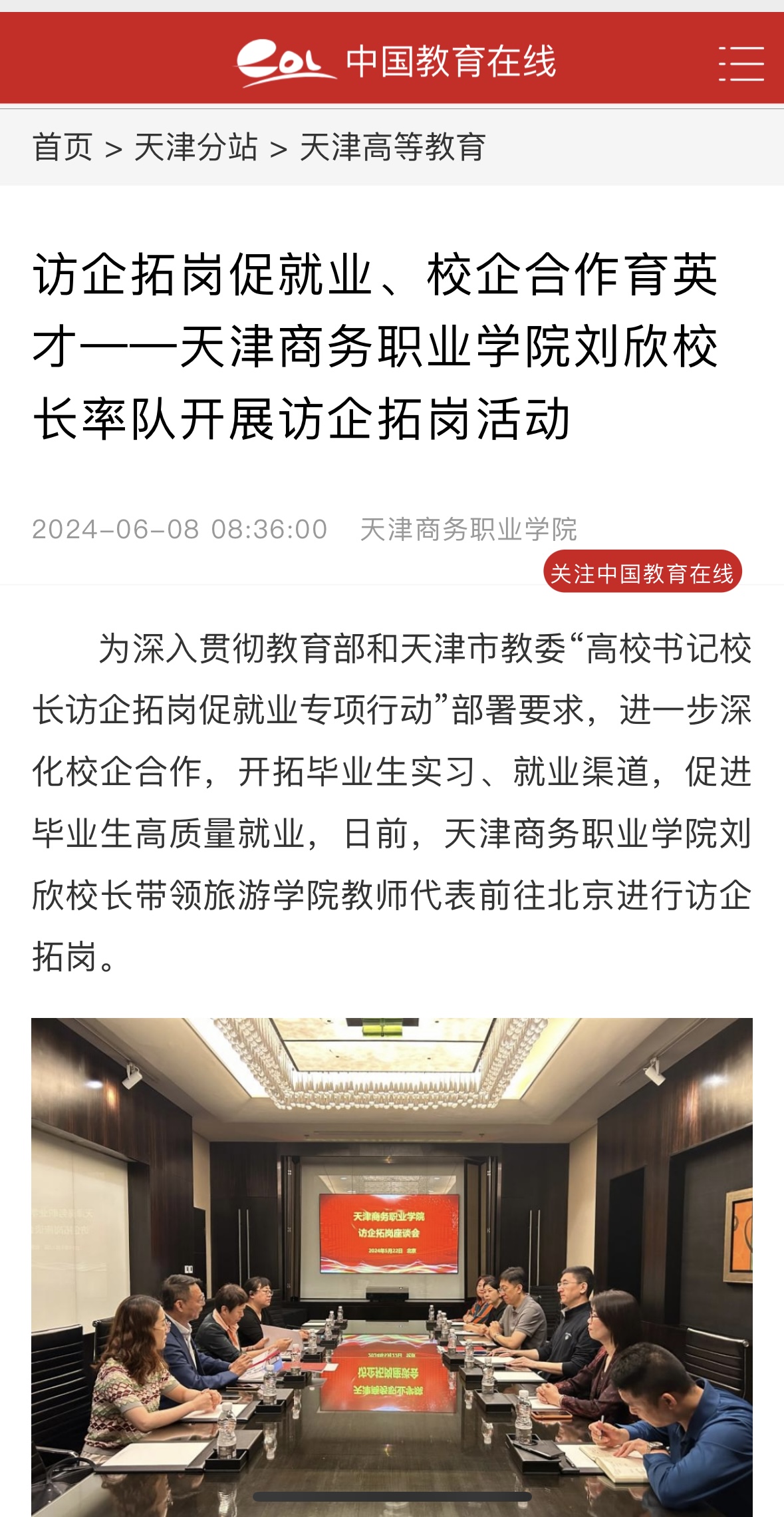 為深入貫徹教育部和天津市教委“高校書記校長訪企拓崗促就業專項行動”部署要求,進一步深化校企合作,開拓畢業生實習、就業渠道,促進畢業生高質量就業,日前,天津商務職業學院劉欣校長帶領旅游學院教師代表前往北京進行訪企拓崗。