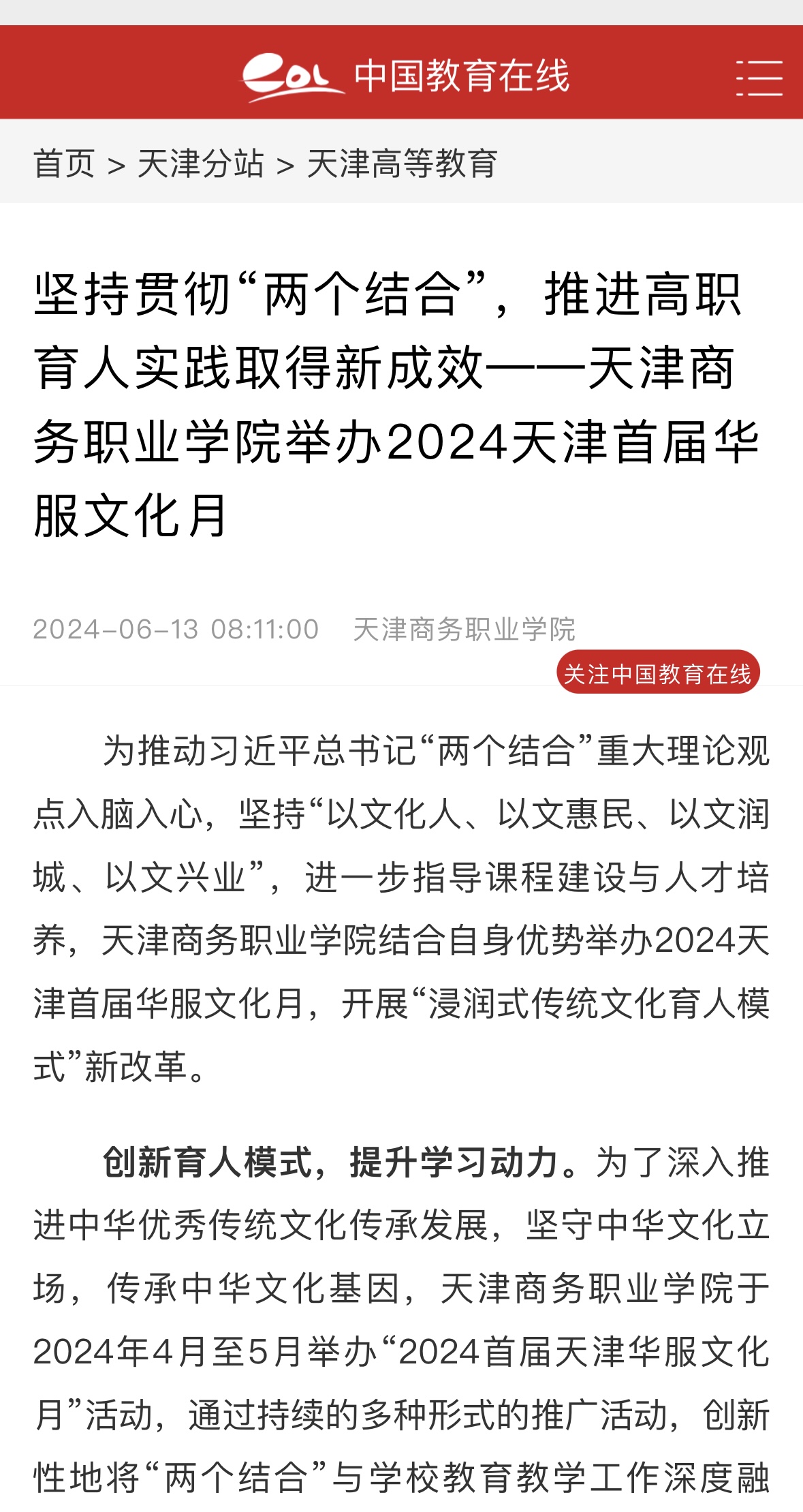 為推動習近平總書記“兩個結合”重大理論觀點入腦入心,堅持“以文化人、以文惠民、以文潤城、以文興業”,進一步指導課程建設與人才培養,天津商務職業學院結合自身優勢舉辦2024天津首屆華服文化月,開展“浸潤式傳統文化育人模式”新改革。