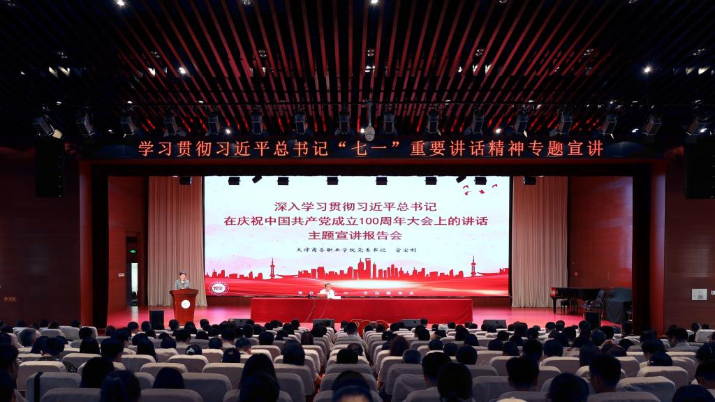 為深刻領會全面貫徹落實習近平總書記“七一”重要講話精神,引導全校黨員干部師生切實把思想和行動統一到講話精神上來,7月20日下午,天津商務職業學院召開深入學習貫徹習近平總書記在慶祝中國共產黨成立100周年大會上的講話主題宣講報告會,報告會由黨委副書記、校長劉欣主持,學校黨委書記宮寶利做專題宣講報告。學校領導班子成員、中層干部、全體黨員和部分學生代表參加。