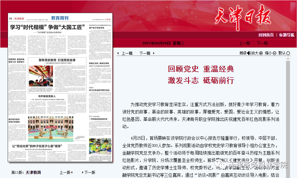 4月28日《天津日報》第11版“教育周刊”以《回顧黨史 重溫經(jīng)典 激發(fā)斗志 砥礪前行》為題,報道我校推出慶祝建黨百年紅色觀影系列活動,邀請嘉賓互動訪談導(dǎo)入電影,創(chuàng)新黨史學(xué)習(xí)教育活動形式,引領(lǐng)廣大師生賡續(xù)紅色血脈,感悟思想偉力。
