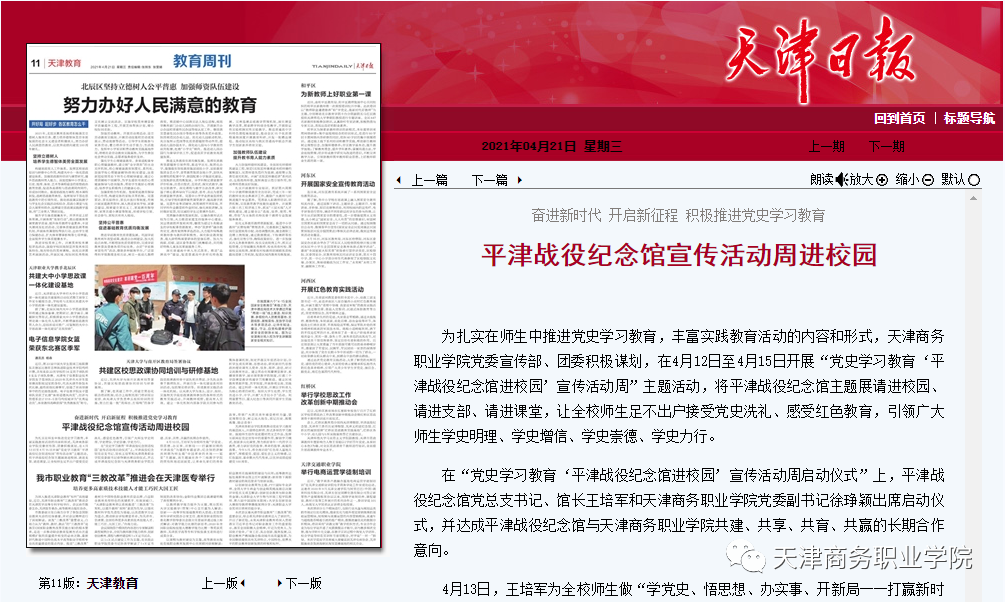 4月21日《天津日?qǐng)?bào)》第11版“教育周刊”以《平津戰(zhàn)役紀(jì)念館宣傳活動(dòng)周進(jìn)校園》為題,報(bào)道我校創(chuàng)新黨史學(xué)習(xí)教育形式,將平津戰(zhàn)役紀(jì)念館主題展請(qǐng)進(jìn)校園、請(qǐng)進(jìn)支部、請(qǐng)進(jìn)課堂,推動(dòng)黨史學(xué)習(xí)教育深入基層。