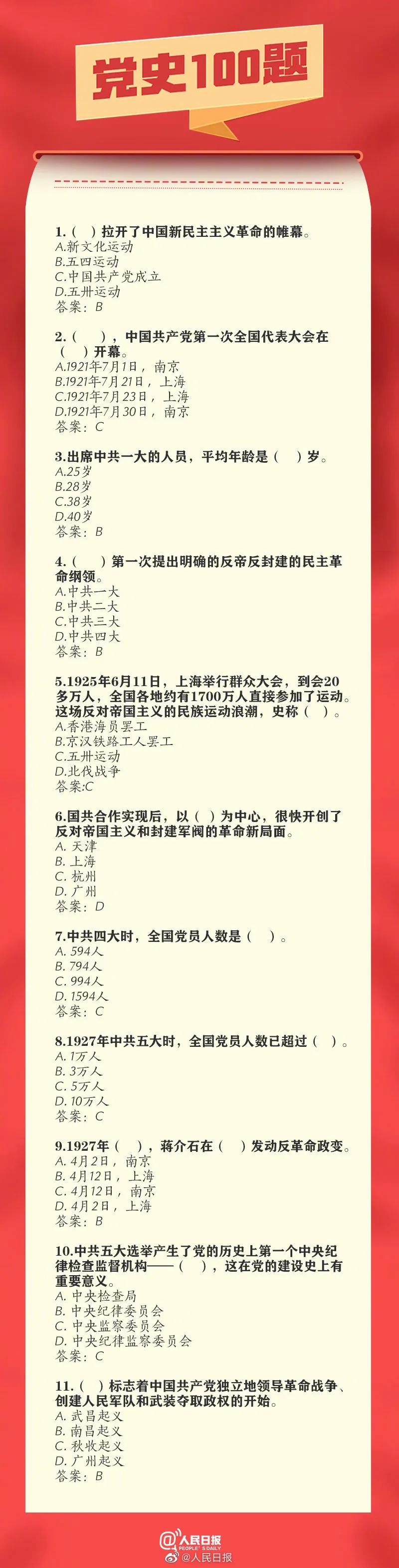 出席中共一大的人員平均年齡是多少歲?中共黨員是何時超過1000萬人的?我國的改革開放由哪次會議揭開序幕?無論我們走得多遠(yuǎn),都不能忘記來時的路。100題重溫百年黨史,戳圖學(xué)習(xí)↓↓