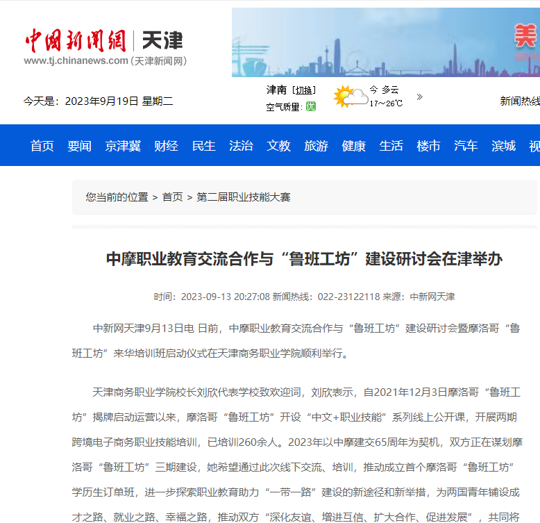 2023年9月13日,中國(guó)新聞網(wǎng)報(bào)道中摩職業(yè)教育交流合作與“魯班工坊”建設(shè)研討會(huì)暨摩洛哥“魯班工坊”來(lái)華培訓(xùn)班啟動(dòng)儀式在天津商務(wù)職業(yè)學(xué)院順利舉行。